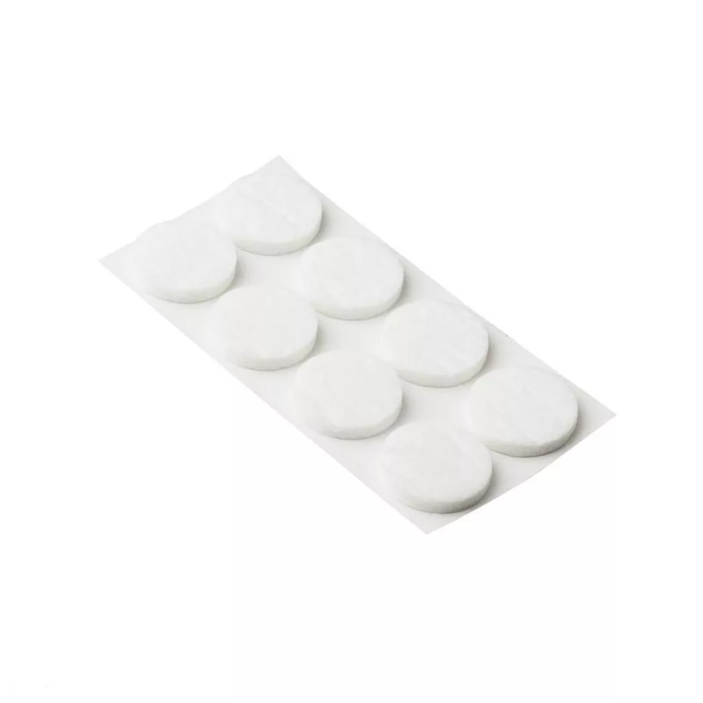 24 mm átmérőjű, öntapadós filcbetétek fehér színben. Védi a felületeket a karcolásoktól.