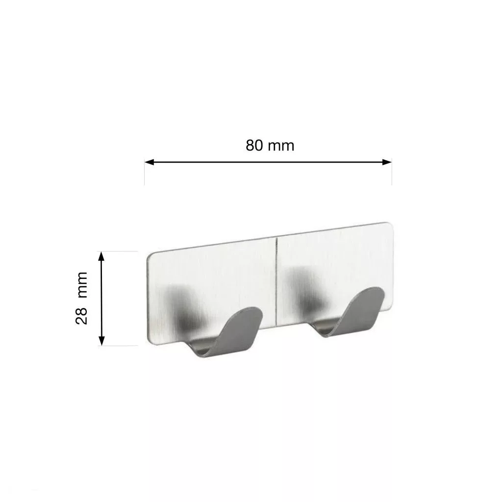 Rozsdamentes acélból készült, öntapadós dupla akasztó, 80 mm szélességgel, 28 mm magassággal és 21 mm mélységgel. Az anyaguknak köszönhetően alkalmasak párás környezetbe - nem rozsdásodnak.