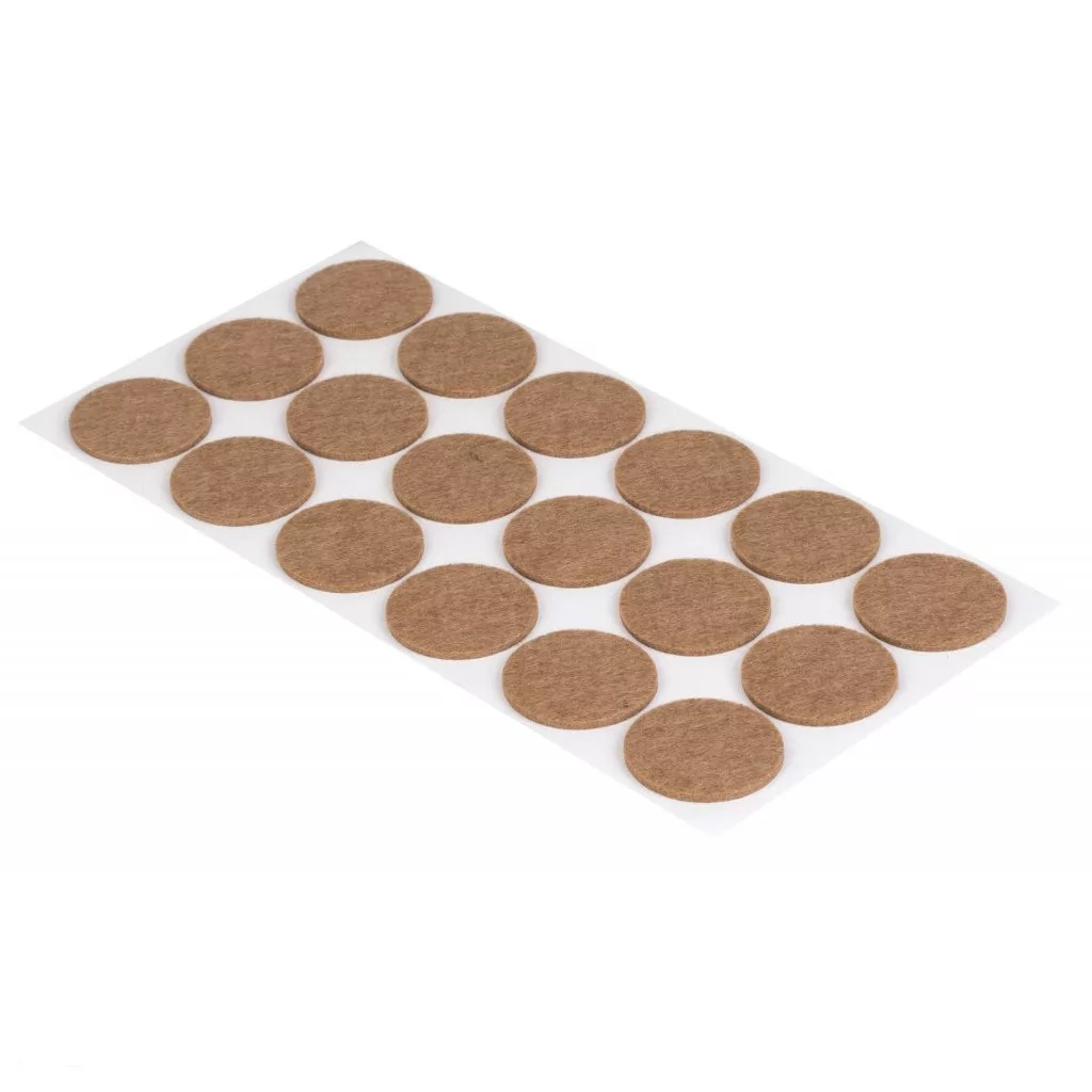 35 mm átmérőjű, barna színű, öntapadós filcpárnák. Védi a felületeket a karcolásoktól.
