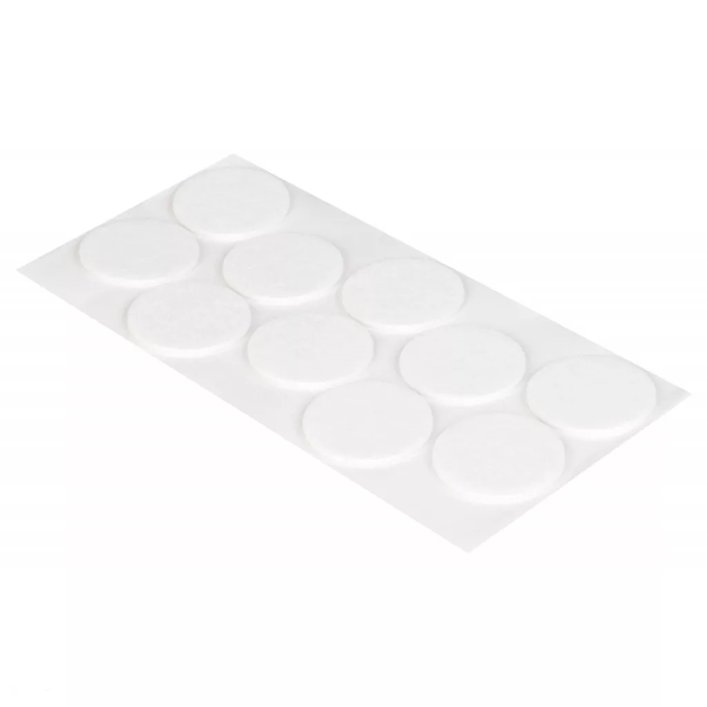 45 mm átmérőjű, öntapadós filcbetétek fehér színben. Védi a felületeket a karcolásoktól.