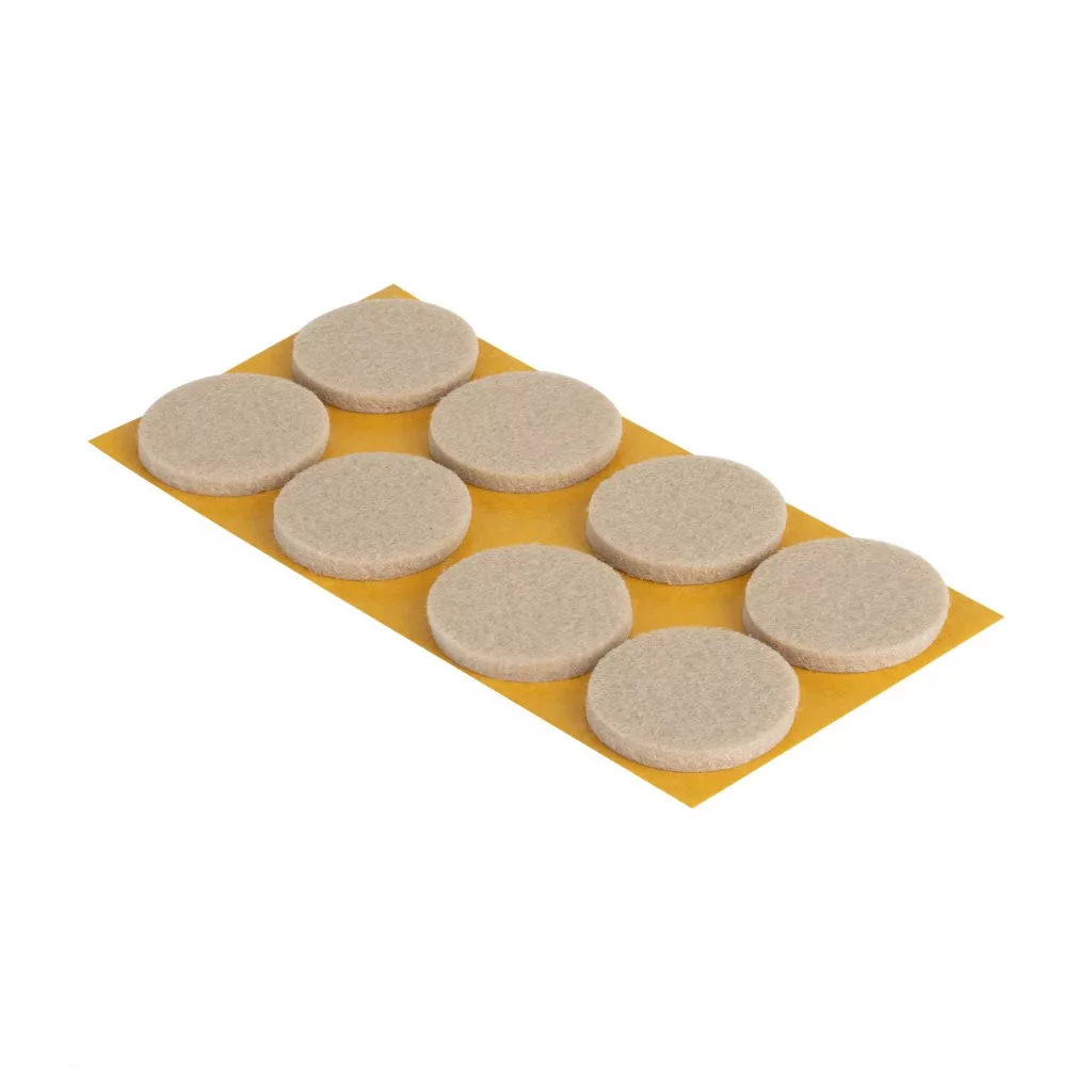 25 mm átmérőjű, bézs színű, öntapadós filcpárnák. Védi a felületeket a karcolásoktól.