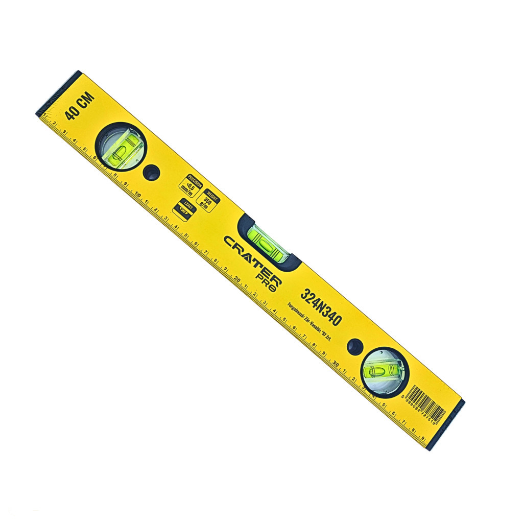 A Crater Pro 400 mm-es vízmérték a sorozat legkisebb, mégis rendkívül funkcionális tagja, élénk sárga színben. Ideális választás, ha a precíziós mérés a cél a legszűkebb, nehezen hozzáférhető helyeken, profi kivitelben. A Crater márkától elvárt minőséget ötvözi a modern funkciókkal, garantálva a tökéletesen pontos eredményt minden helyzetben. Főbb Jellemzők és Előnyök: Profi Kivitel: Az alumínium profil garantálja a funkcionalitást és az alapvető tartósságot a mindennapi használat során. Kompakt Méret: A 400 mm-es hossz tökéletes a kis terekben, sarokban, vagy szerszámosládában való tárolásra, anélkül, hogy a funkcionalitás csorbulna. Élénk Sárga Szín: A feltűnő szín segíti a könnyű észrevételt a zsúfolt munkaterületen, csökkentve az elvesztés kockázatát. 3 Nagy Pontosságú Libella: Vízszintes (felső): A standard vízszintes méréshez. Függőleges (oldalsó): A függőleges felületek (falak, oszlopok) pontos ellenőrzéséhez. 45 fokos (átlós): Speciális szögmérésekhez, például csövezésnél vagy korlátoknál. Jól Látható Buborékok: A libellák tiszta, nagyított betekintőnyílásai és a kontrasztos folyadék biztosítják a mérés gyors és pontos leolvasását még rosszabb fényviszonyok között is. 324N340 Méret: 400 mm