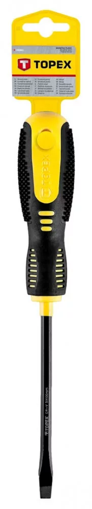 A TOPEX lapos csavarhúzó kiválóan alkalmas szerelési, barkácsolási munkákhoz. Hegye nagy ellenállóképességű, a szerszámnak hosszú élettartamot biztosító króm-vanádium acélból készült. A mágneses hegy megkönnyíti a szerszámmal végzett munkát Az ergonómikus, csúszásmentes anyaggal bevont műanyag markolat biztosítja a kényelmet és a biztonságot a munkavégzés során. A TOPEX márka ezermestereknek készül.