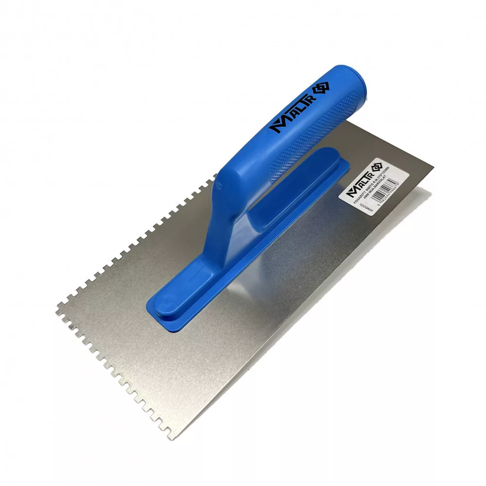 270 mm hosszú fogazott simító, 0,6 mm vastagságú rozsdamentes acélból. A fogak mérete 4 mm. Különböző anyagok felvitelére és fogazott simítására szolgál. Műanyag nyele ergonomikus kialakítású és csúszásmentes redőzéssel készült, a biztonságos és kényelmes munkavégzéshez. A MALTR márka szakembereknek készült.