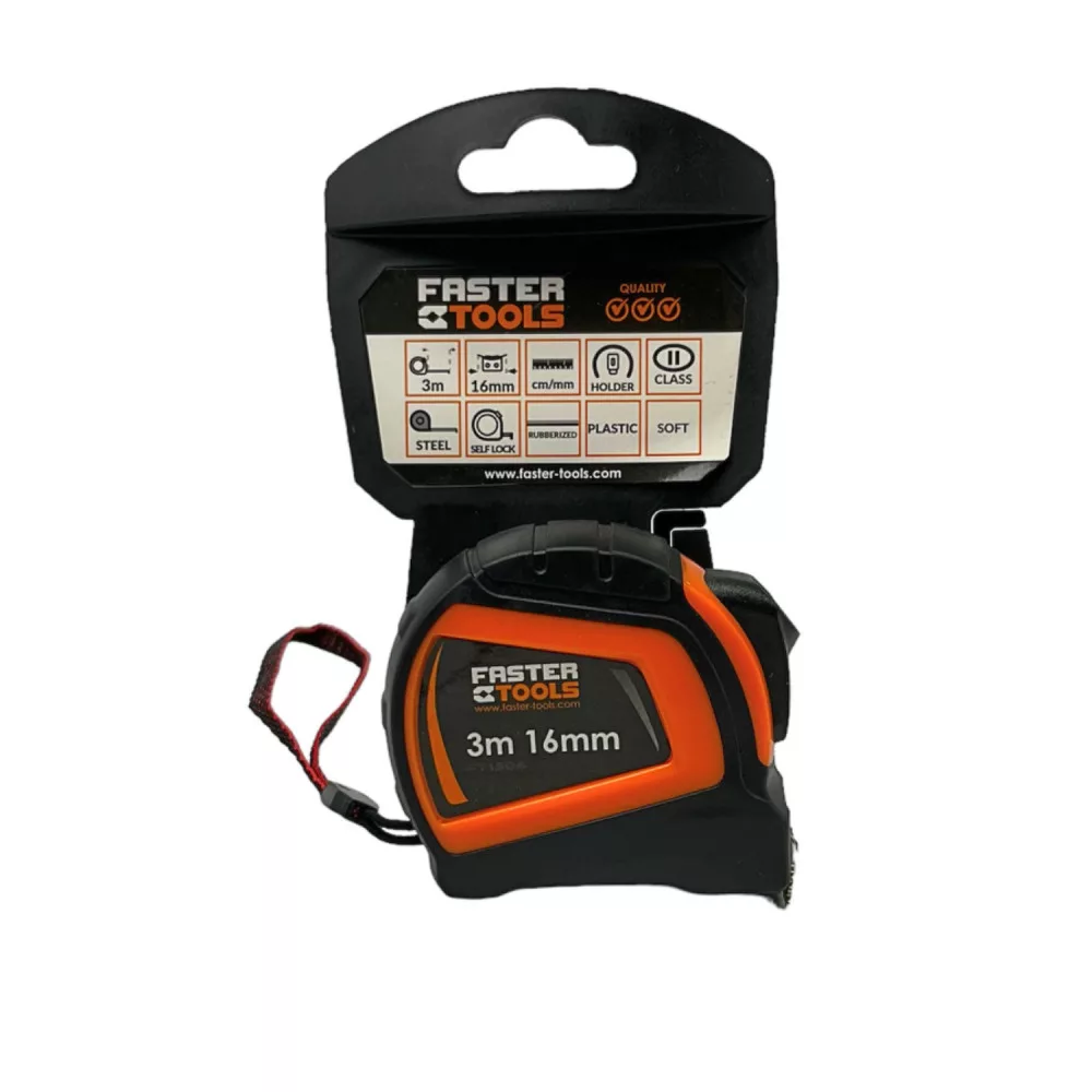 MÉRŐSZALAG 3M/16MM MÁGNESES FT1504 FASTER TOOLS Pontossági osztály II festett acélszalag, sárga gumírozott műanyag burkolat, ami biztos fogást, munkakényelmet biztosít ütésálló a szalagon lévő mágneses mérőhorog lehetővé teszi a pontos belső és külső mérést, három szegecssel van rögzítve önzáró rendszer és automatikus szalag visszatekercselés, övcsipesz
