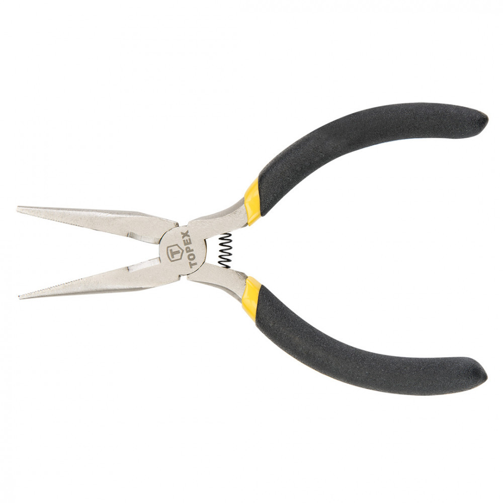 TOPEX 130 mm-es hosszú, egyenes műszerész laposfogó. Edzett acélból készült, a vágófelületek ezen kívül indukciós edzést is kaptak. Az ergonómikus, csúszásmentes anyaggal bevont markolat biztosítja a kényelmet és a biztonságot a munkavégzés során. A termék tökéletesen illeszkedik a kéz alakjához. A fogó a karok alaphelyzetbe visszaállását biztosító visszatérítő rugóval felszerelt, ami javítja a termék használati kényelmét. A TOPEX márka ezermestereknek készül.