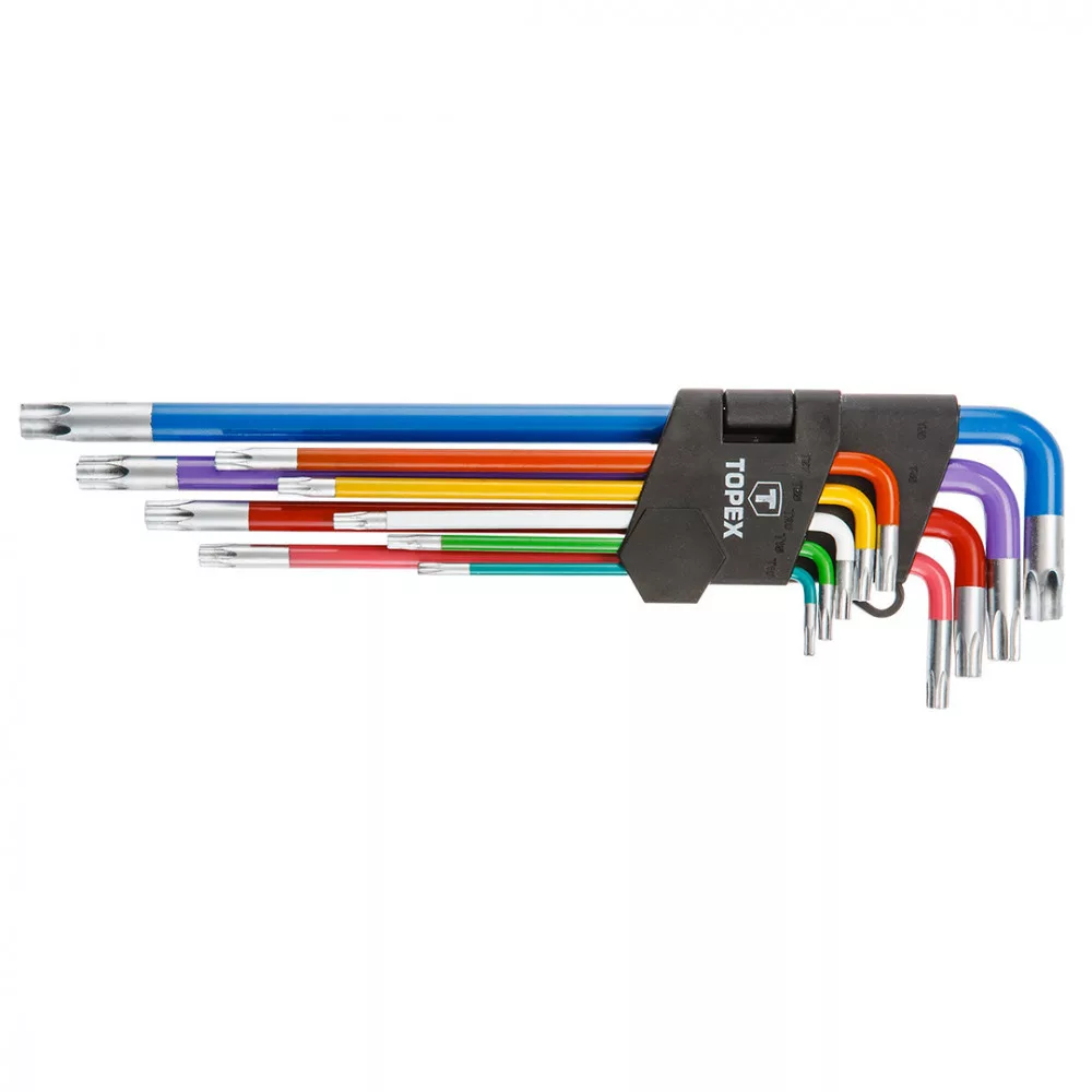 TOPEX Torx kulcskészlet 9 db kulccsal, T10 - T50 közötti méretekben, szilárd króm-vanádium acélból. Minden kulcsméret más színnel jelölt, ami megkönnyíti a feladathoz megfelelő méret kiválasztását. A készlet praktikus csomagolásban kapott helyet. A TOPEX márka ezermestereknek készül.