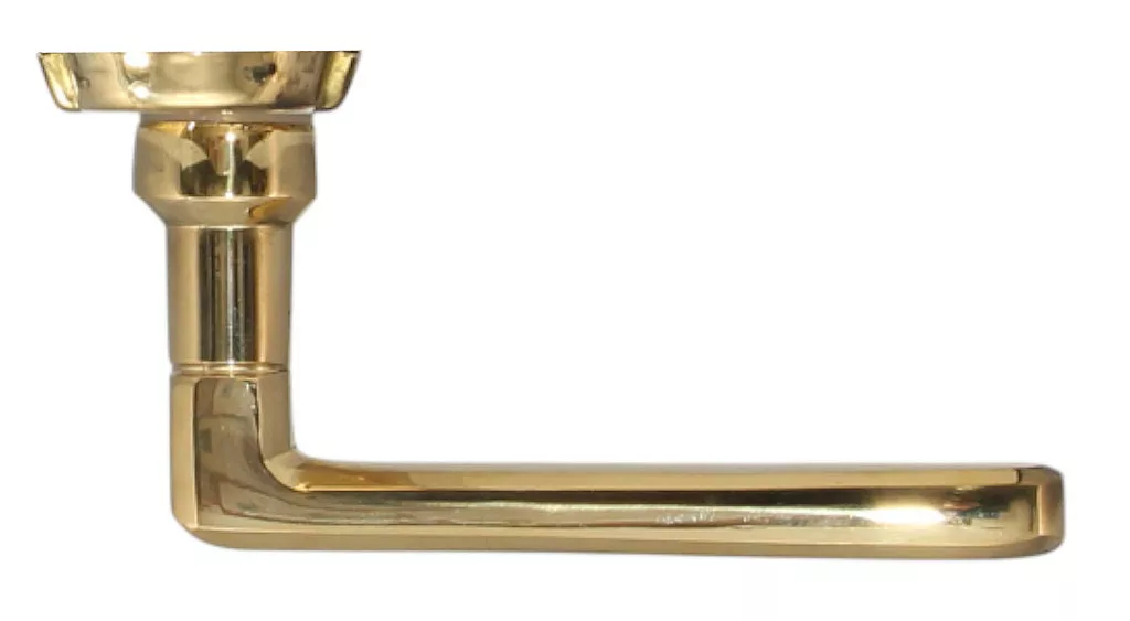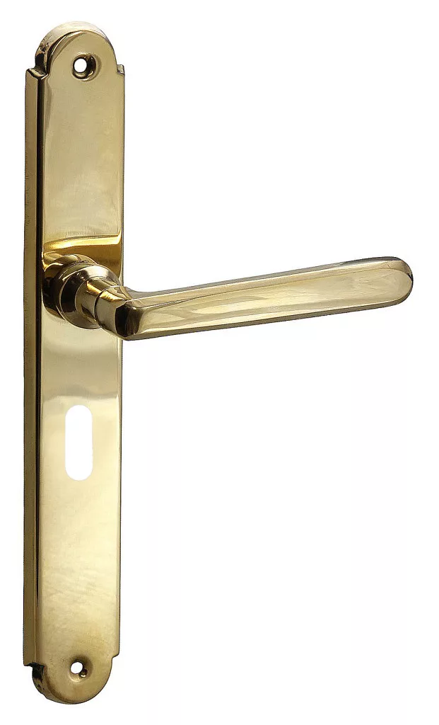 Pret senzational! acest mâner este unul popular în Ungaria. Mânerul este din alamă solidă, iar placa este din tablă de alamă presată. Contine arcuri pentru ca miscarea butonului sa fie usoara. Suprafața sa este lustruită și lăcuită.