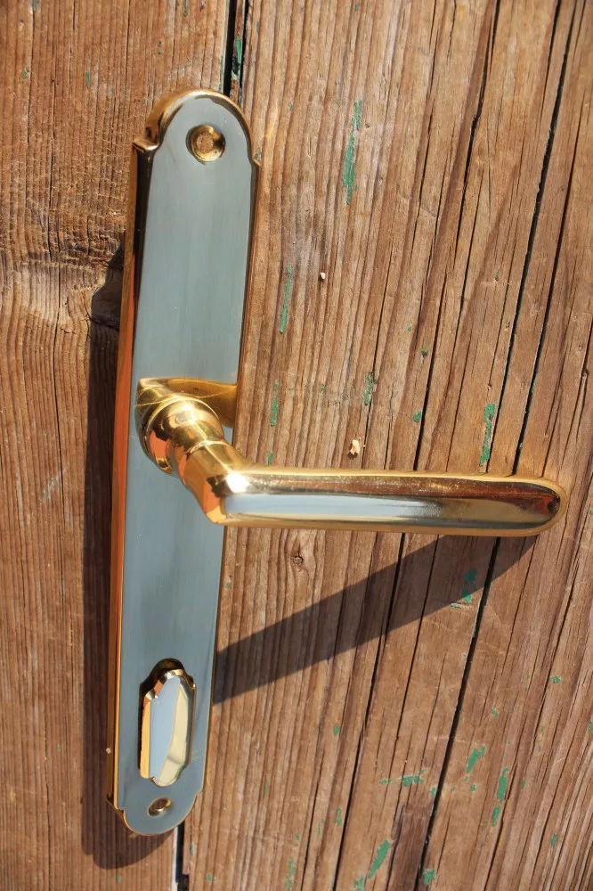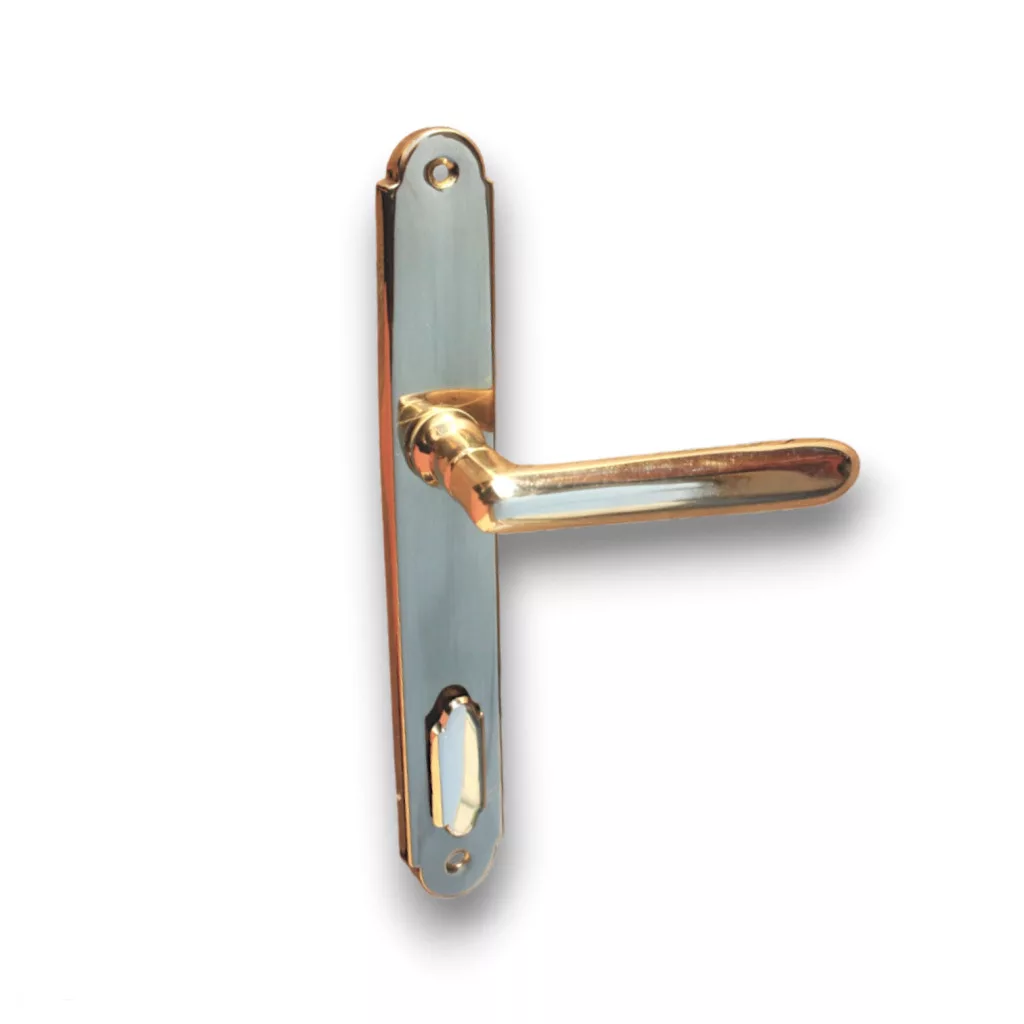 Pret senzational! acest mâner este unul popular în Ungaria. Mânerul este din alamă solidă, iar placa este din tablă de alamă presată. Contine arcuri pentru ca miscarea butonului sa fie usoara. Suprafața sa este lustruită și lăcuită.