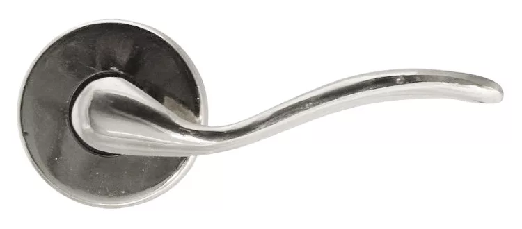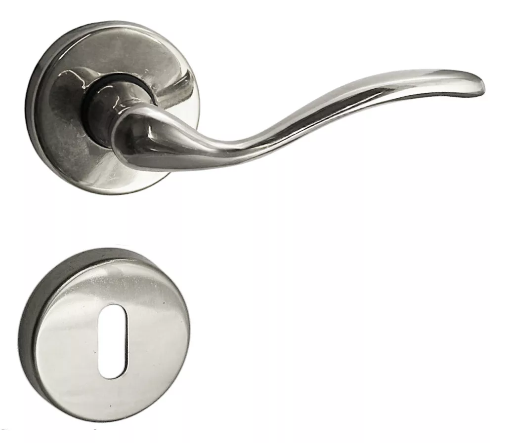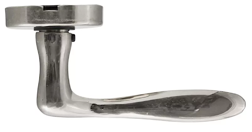 Mâner ușă rozetă în stil italian. Este realizata din alama solida iar suprafata este protejata de crom. Diametrul plăcii este: 48 mm, dimensiunea mânerului este: 110 mm