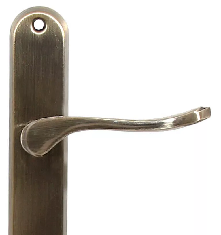 Clan de ușă antic, îndoit ușor, design confortabil. Mânerul ușii este realizat din material NECURU, a cărui suprafață este antichizată într-o culoare negru-gălbuie și protejată cu lac. Mâner acţionat cu arc. Dimensiunea etichetei ușii 239 mm x 36 mm Înălțimea tălpii: 10,5 mm. Dimensiune maner: 120 mm. Proiecție din panoul ușii: 60 mm. Căutați produsele noastre în magazinele OBI DIY!