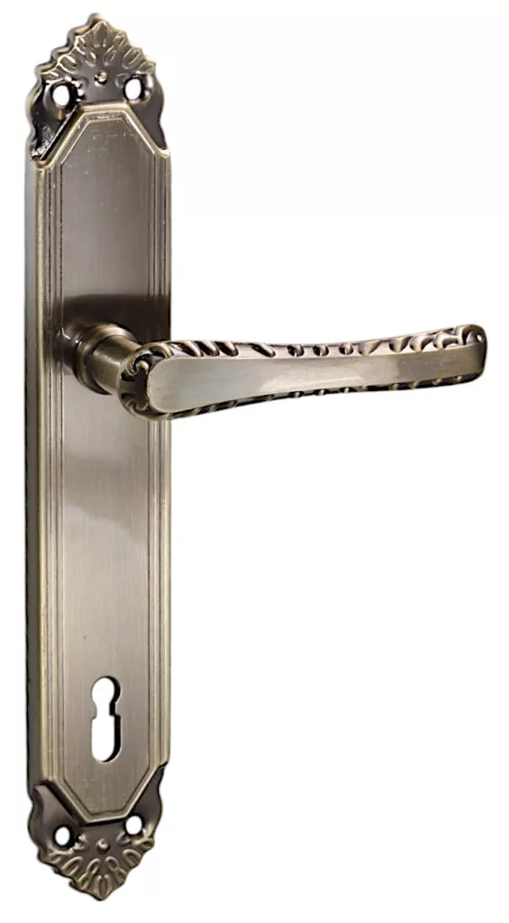Acest produs cu o senzație rustică atrage atenția prin suprafața sa ornamentată, canelată, care poartă semnele ornamentației. Acest produs nu este fabricat din material de cupru, suprafața lui primește forma finală prin galvanizare. Finisaj antic lustruit granulat, protejat cu lac. Dimensiune etichetă de ușă 240 mm X 39 mm. Dimensiune maner: 107 mm. Design de primăvară. Cauta-l si in MAGAZINE OBI!