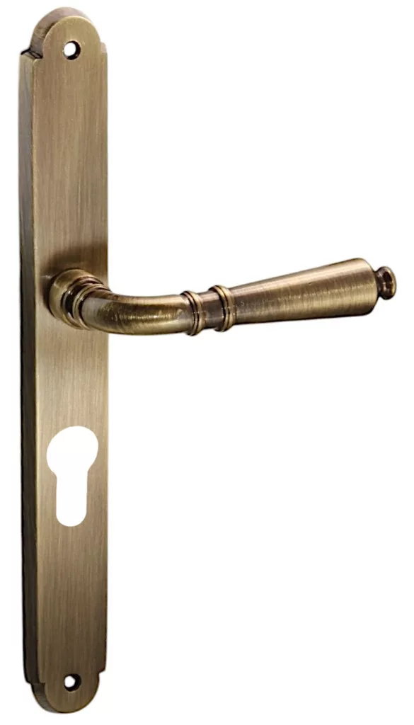 Set de mânere cu suprafață antică. Cu o suprafață texturată. Un produs elegant, curat, pentru eleganța de zi cu zi. Recomandăm acest tip tuturor pentru că poate fi montat cu ușurință pe toate tipurile de încuietori fără măsurare. Trebuie doar să decideți dacă aveți nevoie de un pumn pentru cheie sau cilindru. Punctele de fixare sunt acoperite cu elemente decorative din cupru, astfel încât designul lor este foarte estetic. Un șurub Allen suplimentar de fixare este plasat în mânerele ușii, făcând astfel mânerul ușii și mai robust. Suprafața sa strălucitoare de cupru face ca produsul să fie cu adevărat elegant. Piesa clasica, eleganta, confortabila.