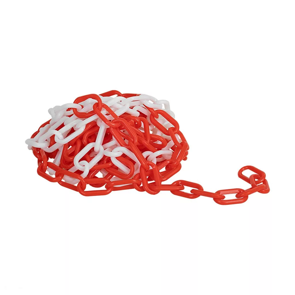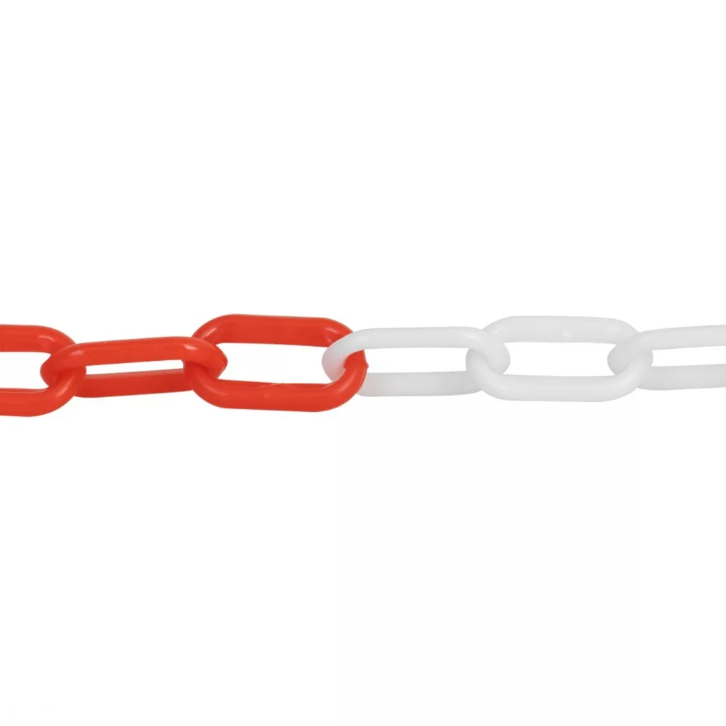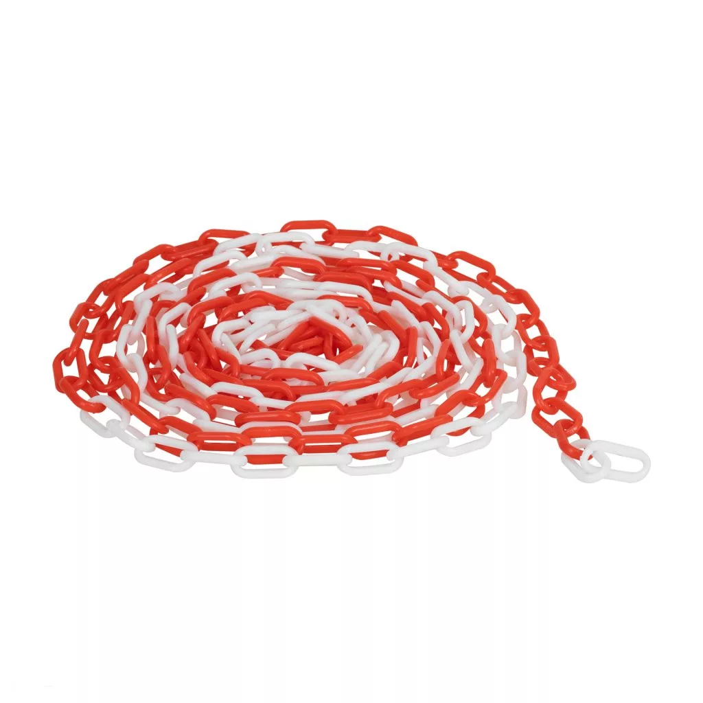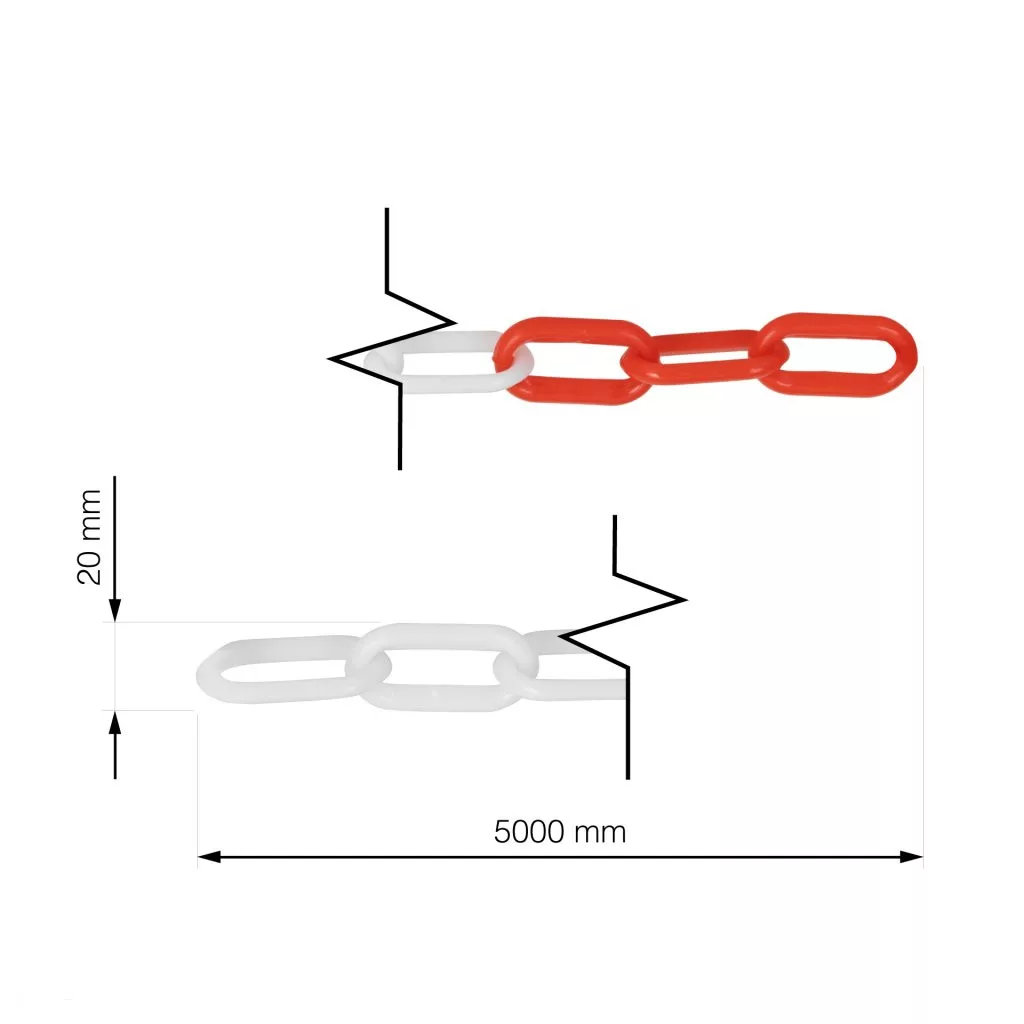 Piros-fehér szegélyjelző lánc, 20 mm széles és 5000 mm hosszú.