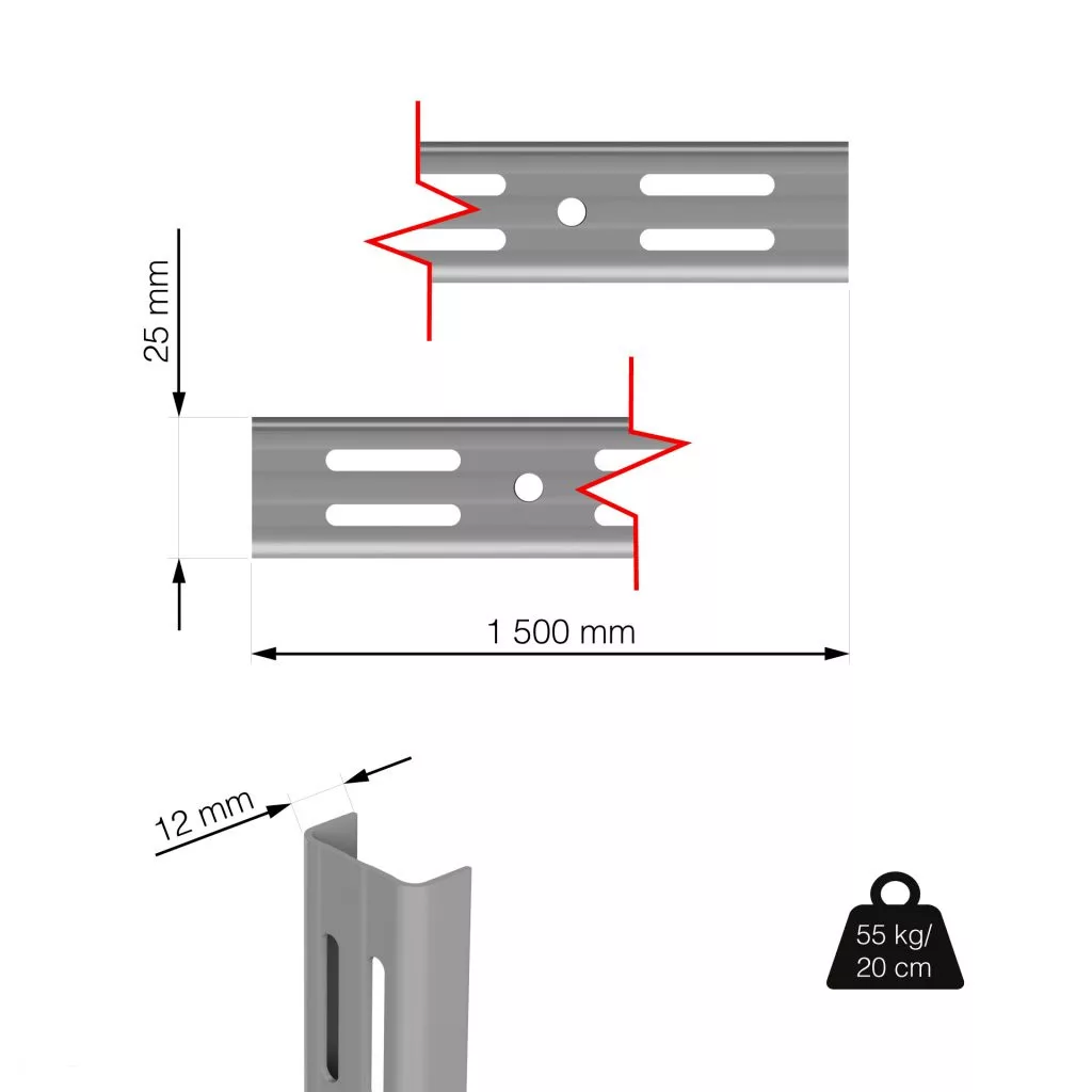 Ezeket a falhoz rögzíti, és ez alkotja a tartószerkezet alapját. Rögzítési lyukakkal és hornyokkal vannak ellátva, amelyekbe a gerendák könnyen bepattinthatók a polcokra. A belső tér stílusától függően válasszon fehér, matt fekete vagy ezüst színű változatot 500–2000 mm hosszúságban.