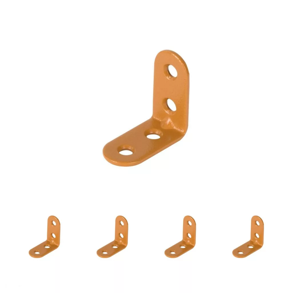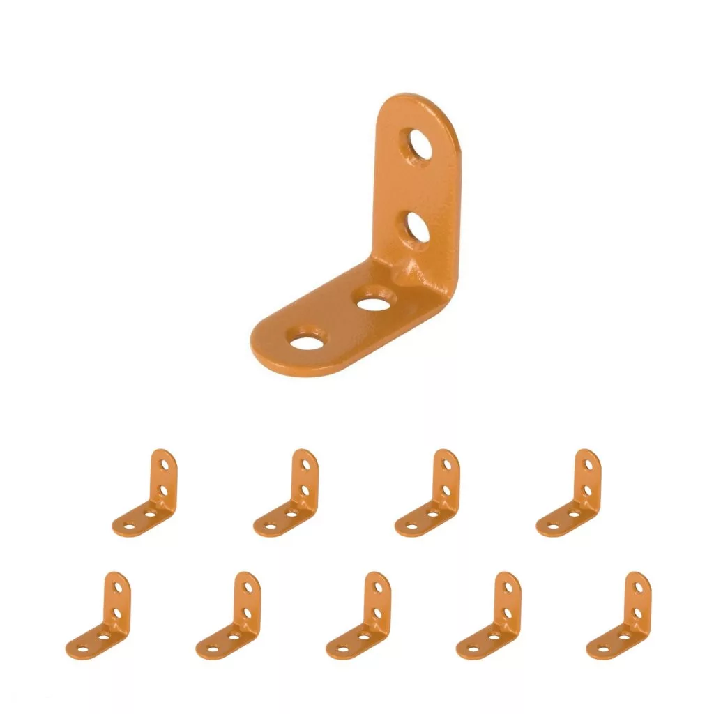 Bézs színű acél összekötő szögidom, 15 mm széles és 30 mm magas, süllyesztett rögzítőfuratokkal.