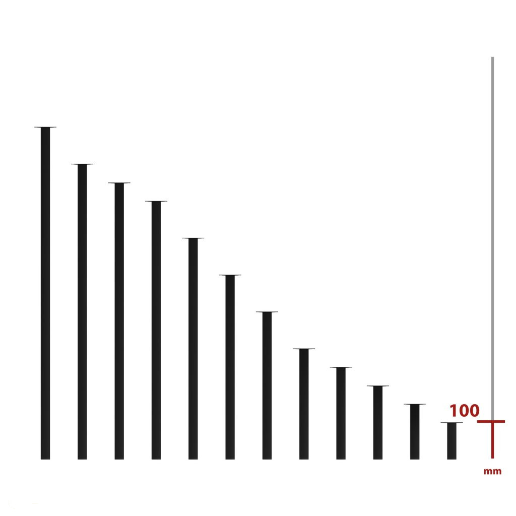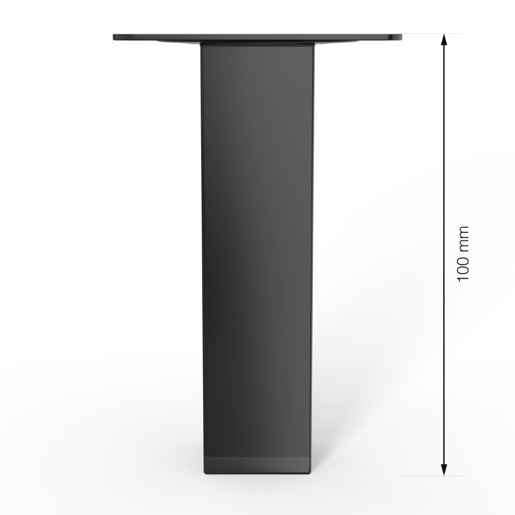 Négyzet alakú fém bútorláb fekete színben, 25x25 mm profilból, 100 mm magas, 60x60 mm-es talppal és alsó műanyag csúszótalppal.