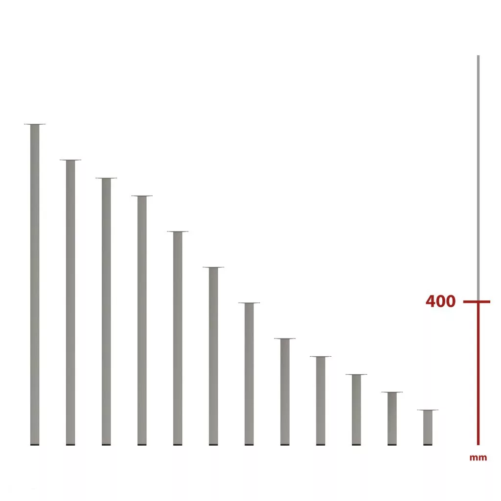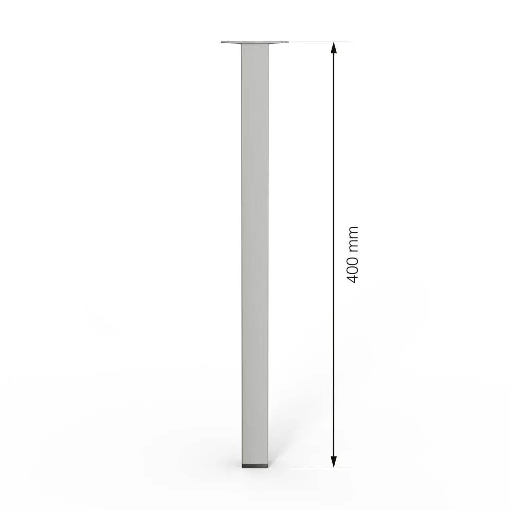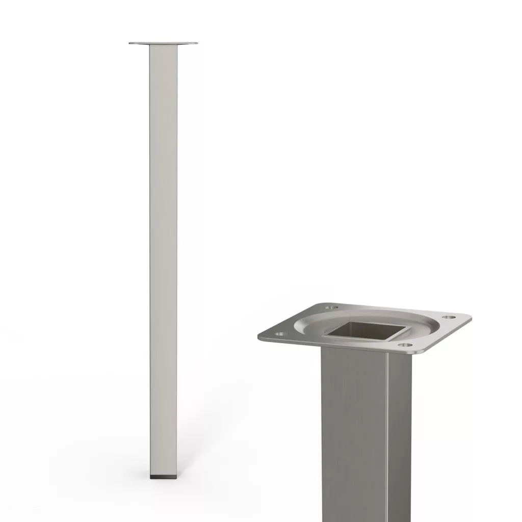 Négyzet alakú fém bútorláb szálcsiszolt nikkel felülettel, 25x25 mm-es profilból, 400 mm magas, 60x60 mm-es lemezzel és alsó műanyag csúszótalppal.