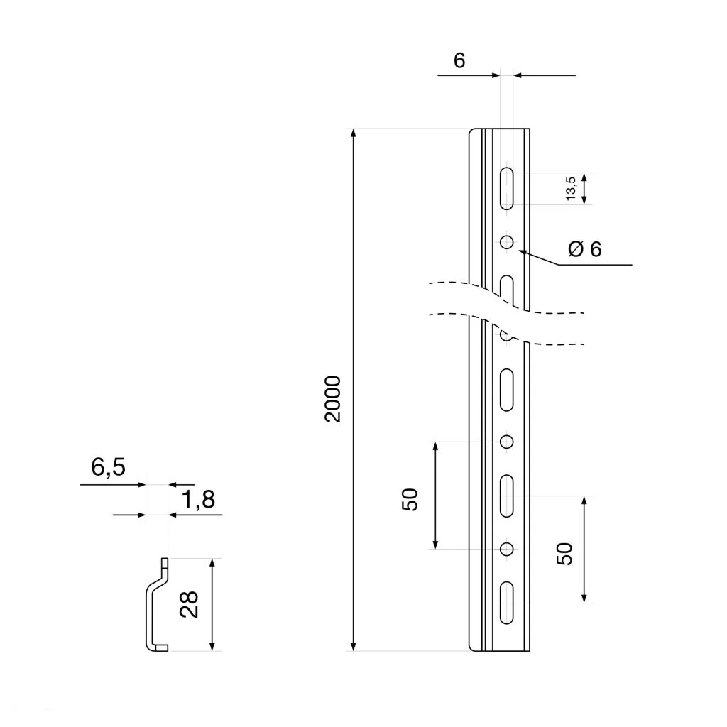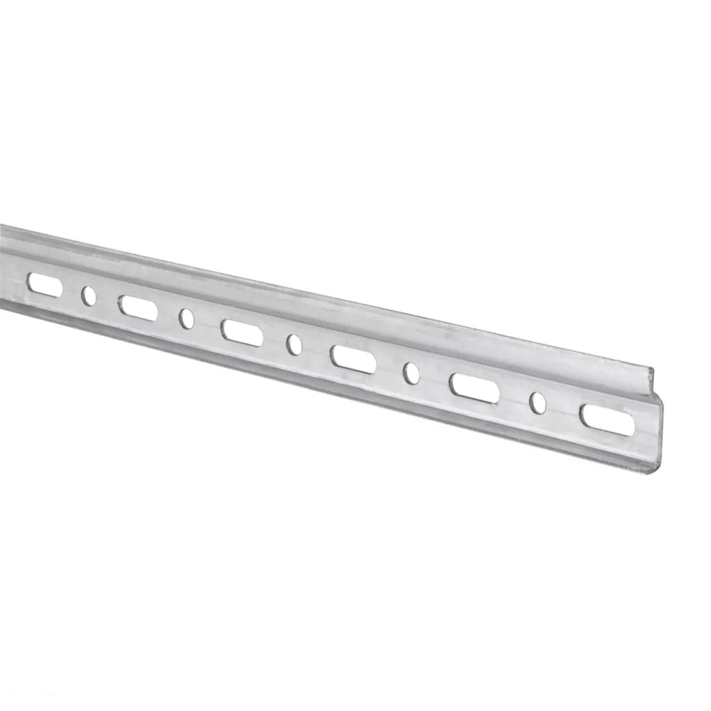 2000 mm hosszú, 28 mm magas és 1,8 mm vastag horganyzott acél függesztősín, 150 kg teherbírással, fali szekrények felfüggesztésére alkalmas.