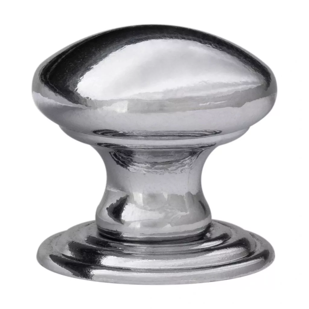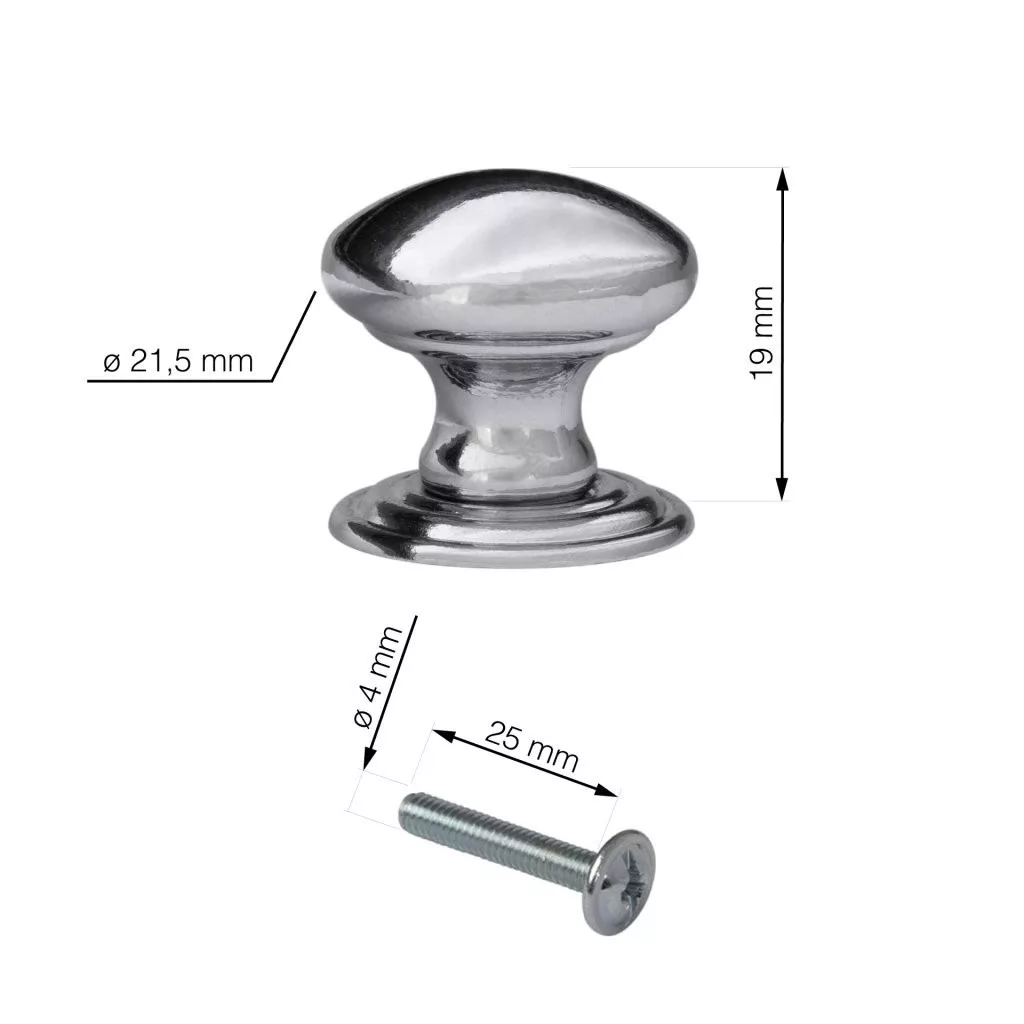22-es méretű bútorgomb klasszikus króm kivitelben, 22 mm átmérővel és 19 mm magassággal. A csomag tartalmaz egy rögzítőcsavart.