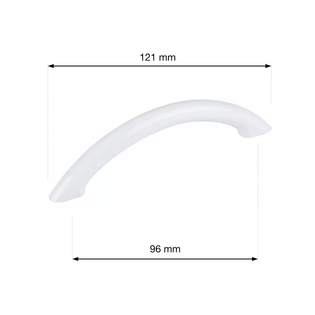 Klasszikus dizájnú, műanyag Béta bútorfogantyú, 96 mm-es rasztermérettel, fehér színben. A fogantyú hossza 121 mm, szélessége 10 mm, magassága 30 mm. Rögzítőcsavarokkal együtt.