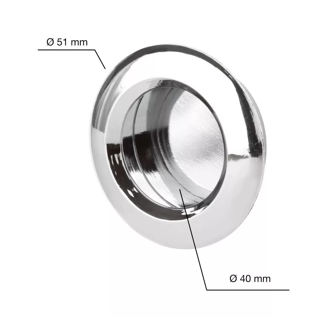 51 mm átmérőjű és 15 mm magas, krómozott műanyag bútorfogantyú. A süllyesztett fogantyú átmérője 40 mm, mélysége 11 mm.
