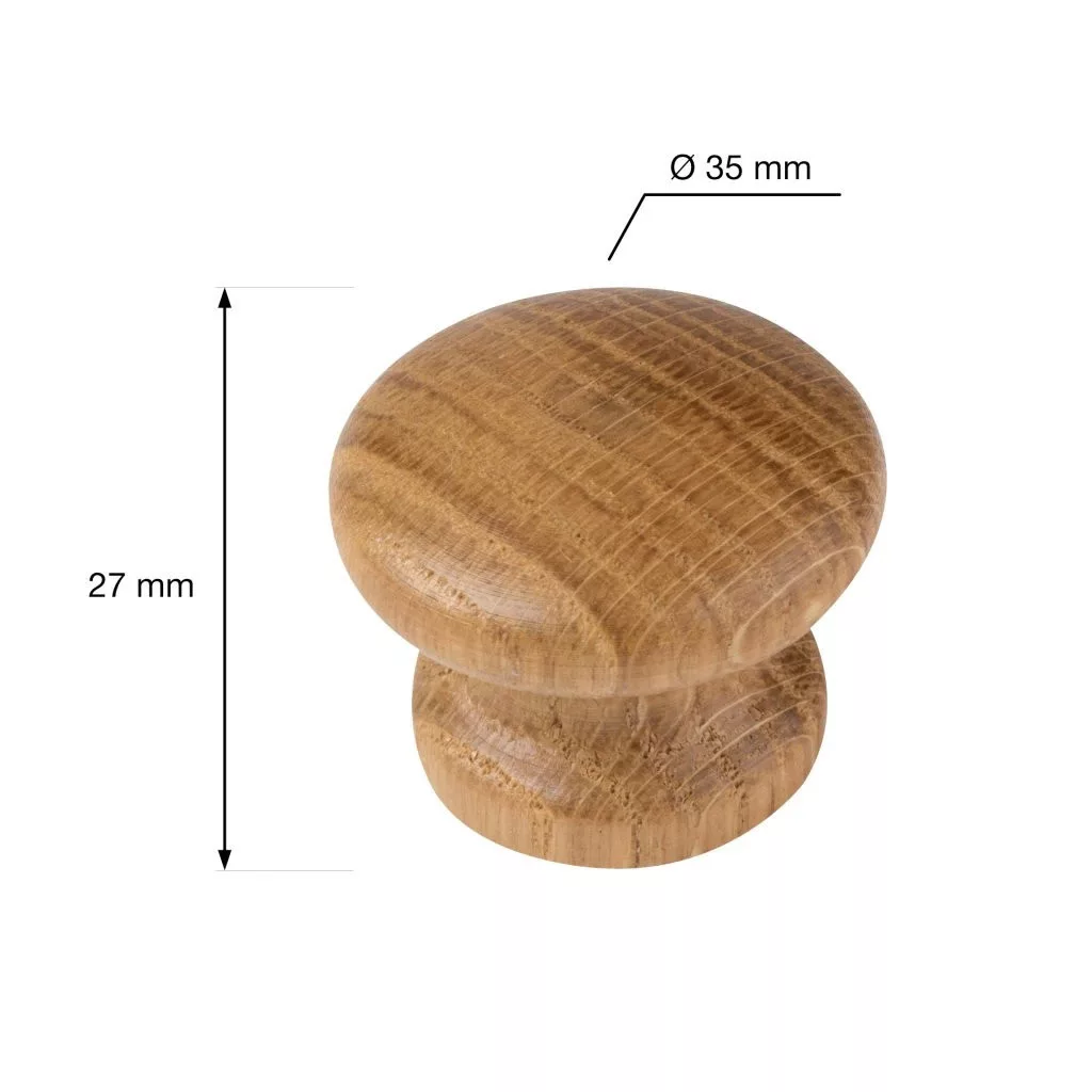 Humberto fa bútorgomb lakkozott tölgyfa kivitelben, átmérője 35 mm, magassága 27 mm. Rögzítőcsavarral együtt.