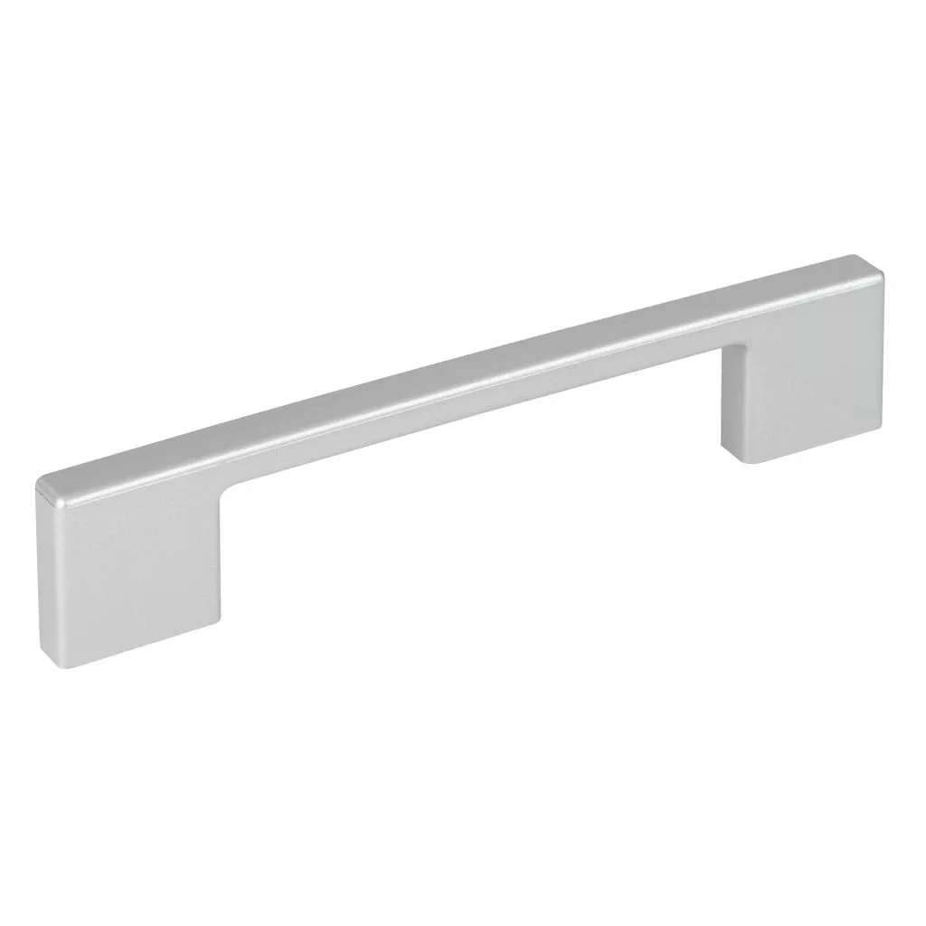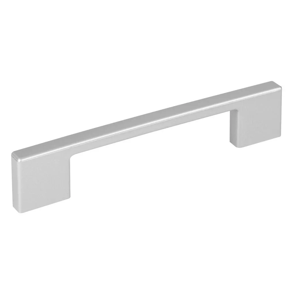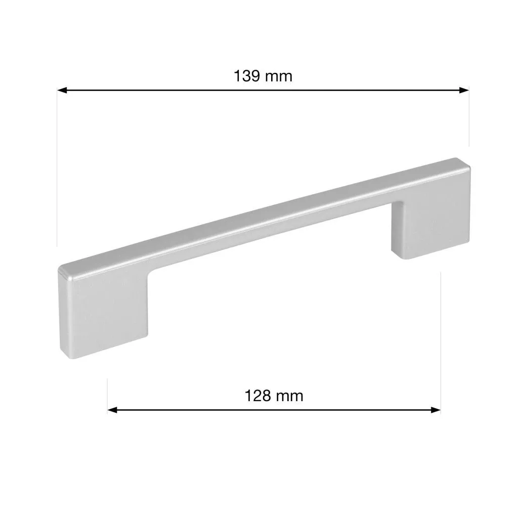 Modern műanyag bútorfogantyú 128 mm-es tengelytávolsággal, ezüst színű. A fogantyú hossza 139 mm, szélessége 9,5 mm, magassága 27,5 mm. Rögzítőcsavarokkal együtt.