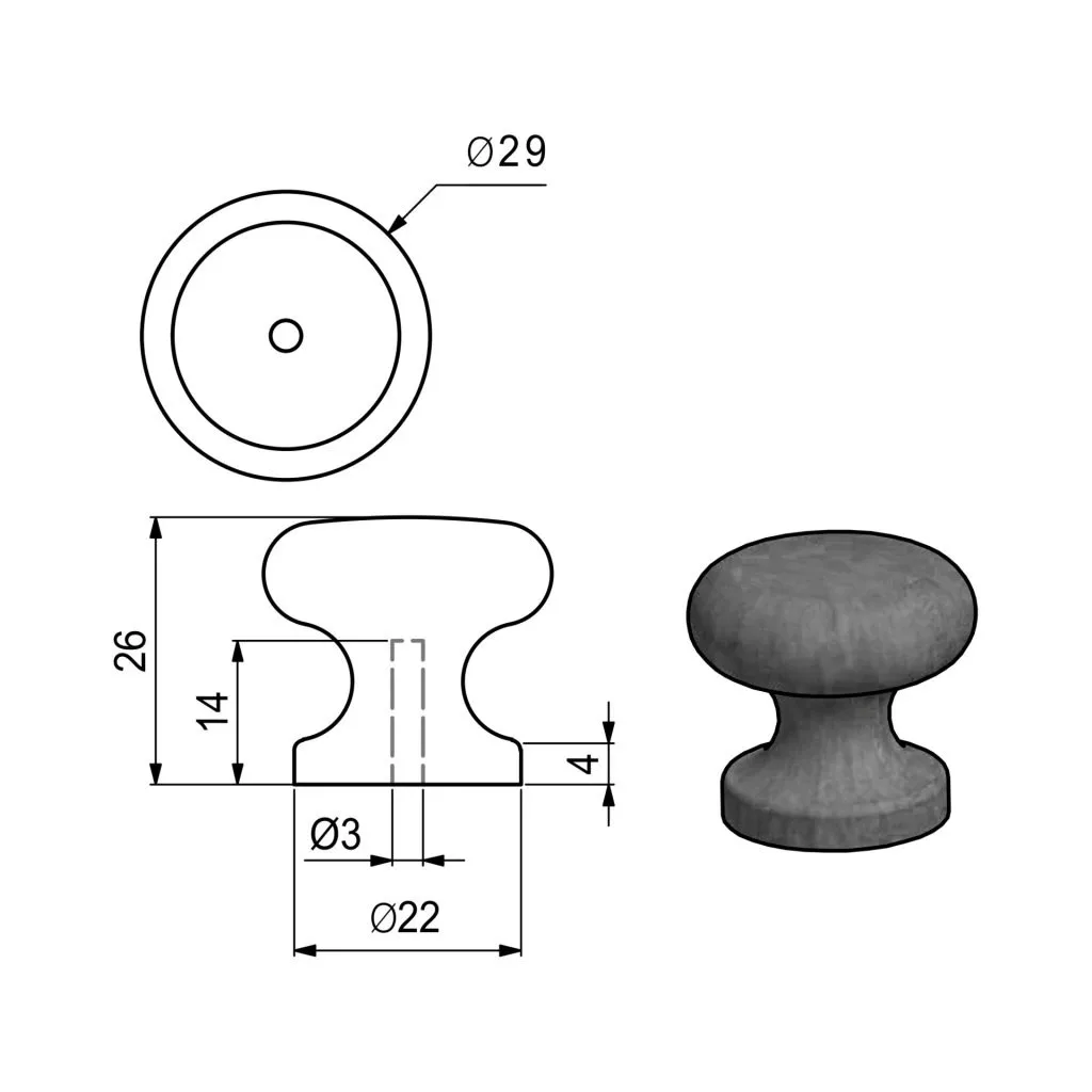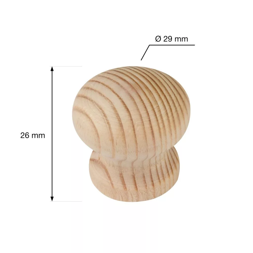 Lara fa bútorgomb natúr fenyő kivitelben, 29 mm átmérőjű és 26 mm magas. A csomag tartalmaz egy rögzítőcsavart.