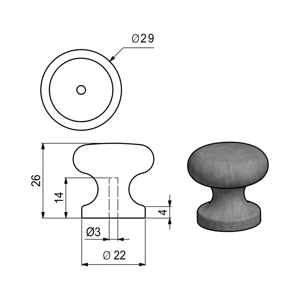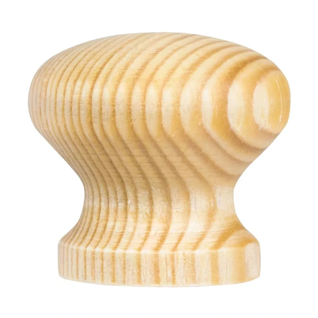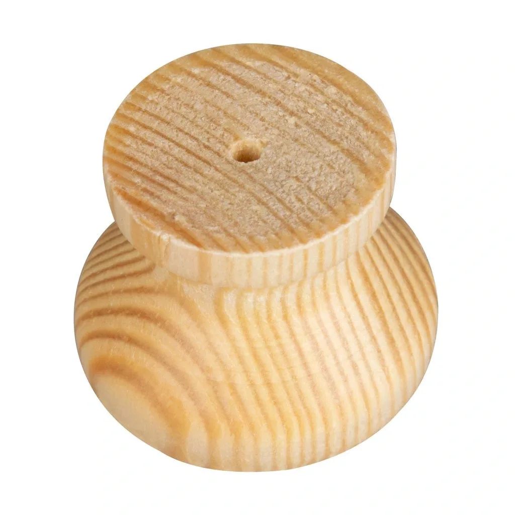 Lara fa bútorgomb lakkozott fenyőből, 29 mm átmérőjű és 26 mm magas. Rögzítőcsavarral együtt.