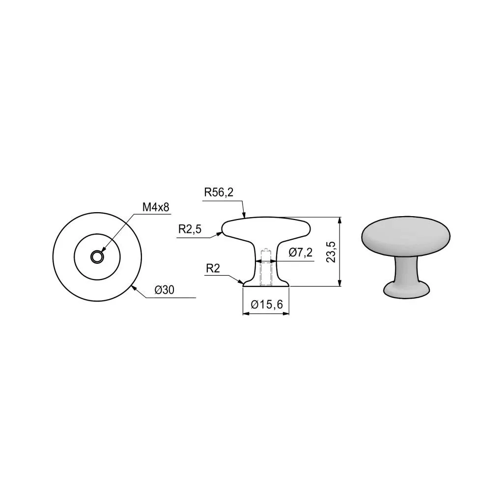 Daira bútorgomb klasszikus dizájnnal, szálcsiszolt szatén nikkel kivitelben, 30 mm átmérőjű és 24 mm magas. A csomag tartalmaz egy rögzítőcsavart.