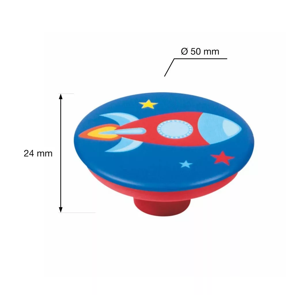 50 mm átmérőjű és 24 mm magas Raketa műanyag gyerek bútorgomb. A csomag tartalmaz egy rögzítőcsavart.