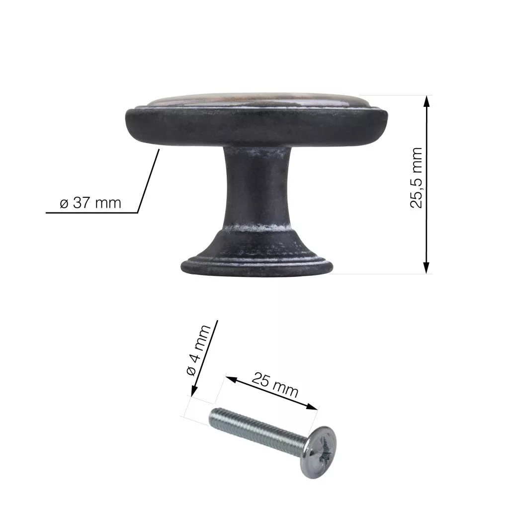 Rusztikus bútorgomb Woman I fekete rozsda mintával, 37 mm átmérőjű és 26 mm magas. A csomag tartalmaz egy rögzítőcsavart.