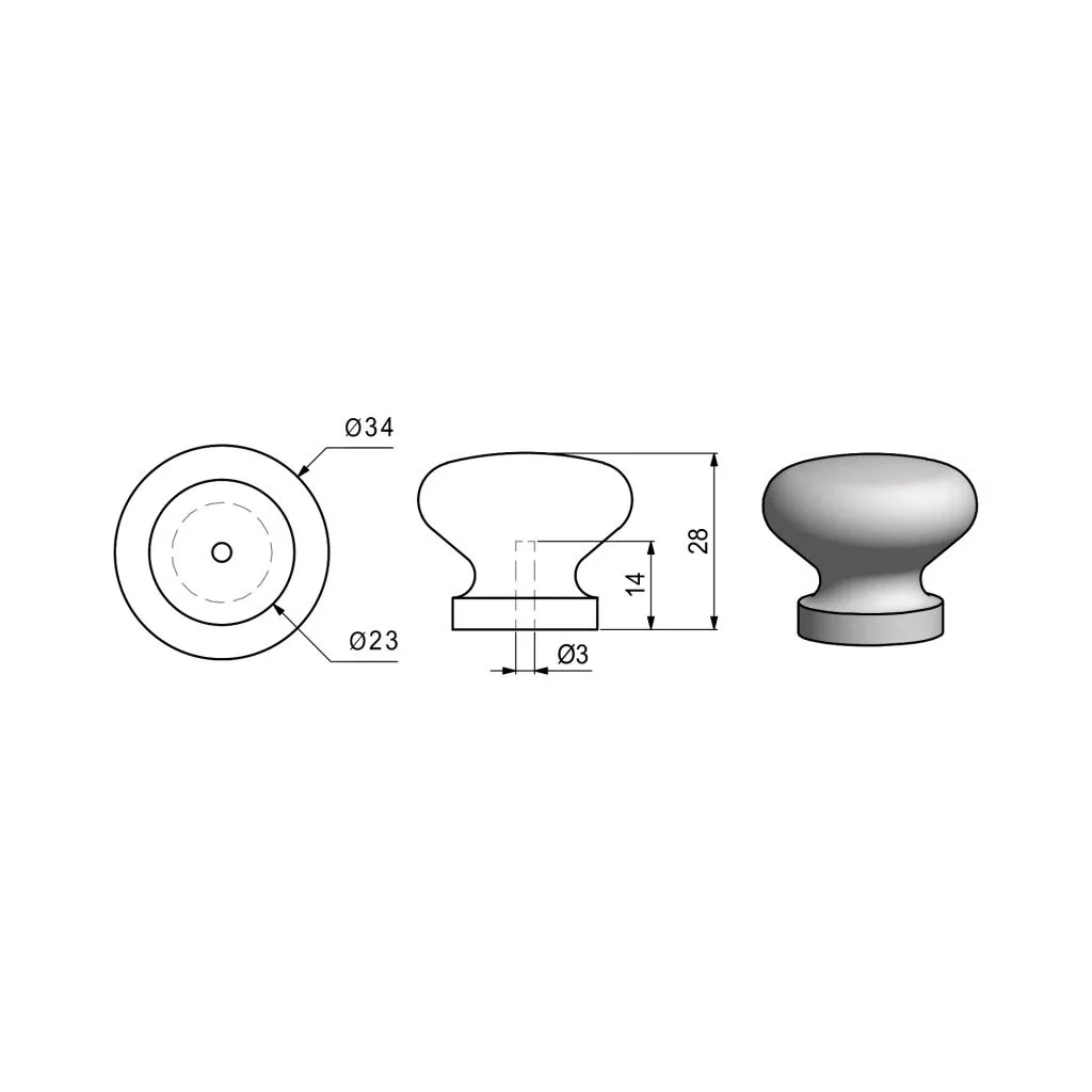 Lara fa bútorgomb, fehér fenyőfából készült, 34 mm átmérőjű és 28 mm magas. A csomag tartalmaz egy rögzítőcsavart.