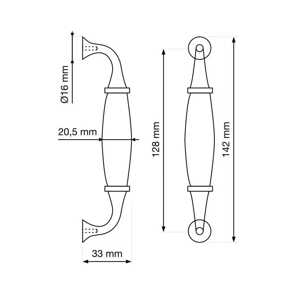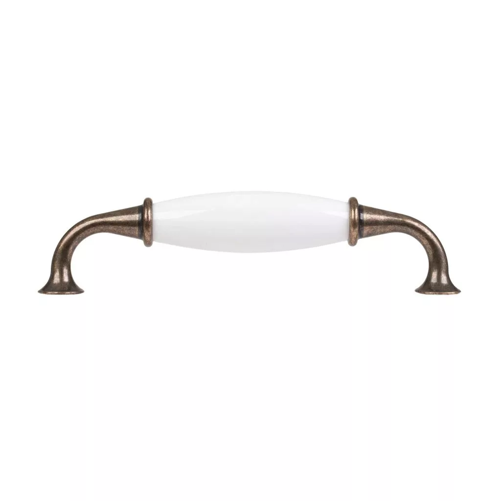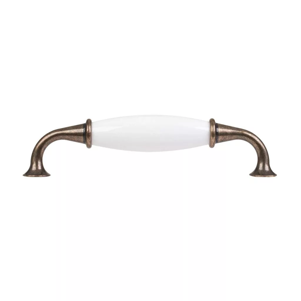 Rusztikus stílusú bútorfogantyú 128 mm-es tengelytávolsággal és antik sárgaréz felülettel, fehér porcelán fogantyúval kiegészítve. A fogantyú hossza 142 mm, szélessége 20,5 mm és magassága 33 mm. Rögzítőcsavarokkal együtt.