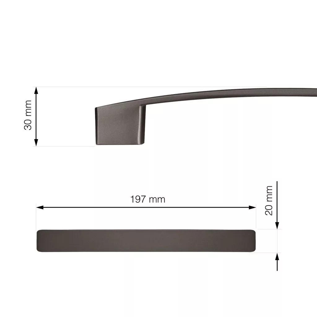 Modern alumínium Anzio bútorfogantyú, 160 mm-es tengelytávolsággal, antracit színben. Fogantyúhossz 197 mm, szélesség 20 mm és magasság 30 mm. Rögzítőcsavarokkal együtt.