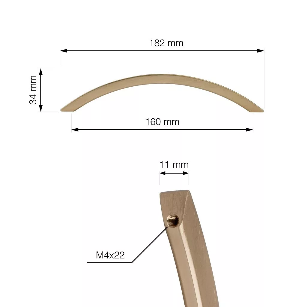 Modern Bari bútor fogantyú 160 mm-es tengelytávolsággal és szálcsiszolt sárgaréz felülettel. A fogantyú hossza 182 mm, magassága 34 mm. Rögzítőcsavarokkal együtt.