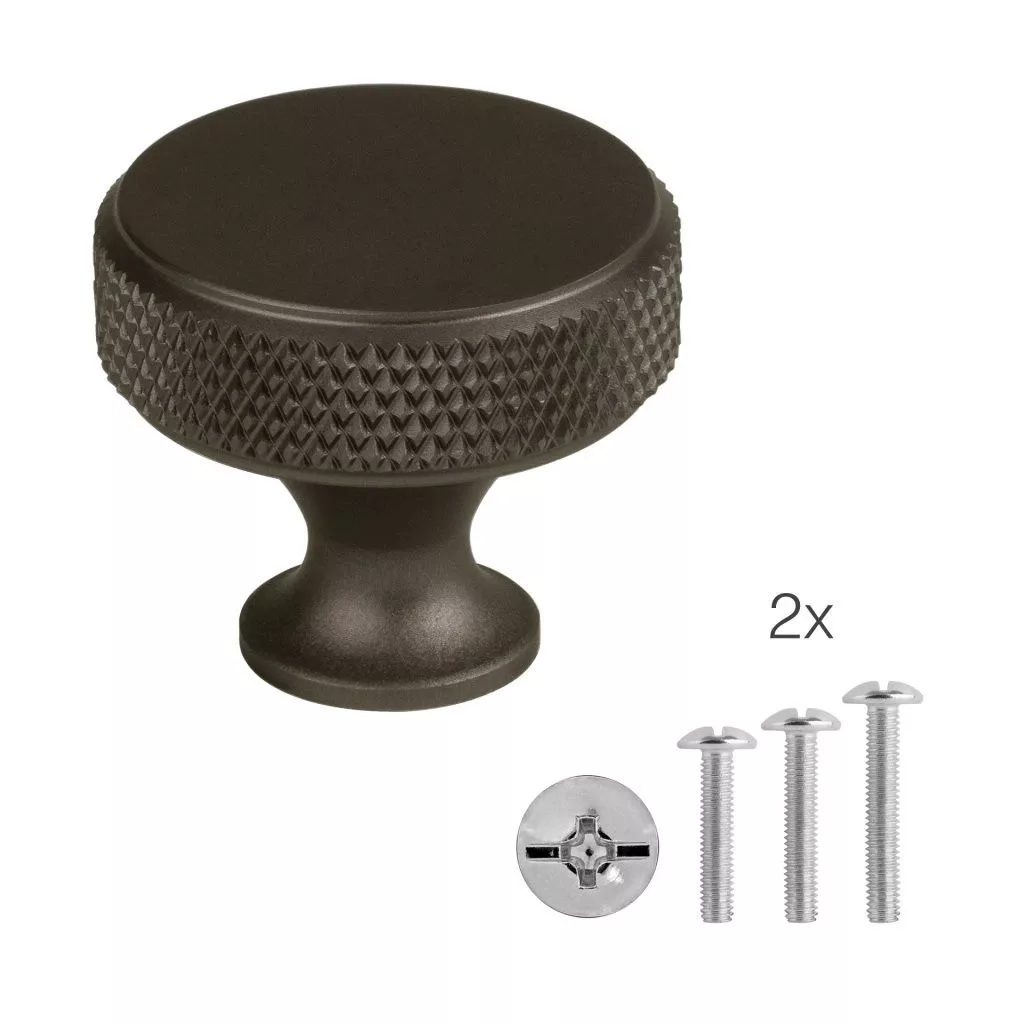 Dieren bútorgomb klasszikus dizájnban, barna színben, 30 mm átmérőjű és 26 mm magas. A csomag tartalmaz egy rögzítőcsavart.