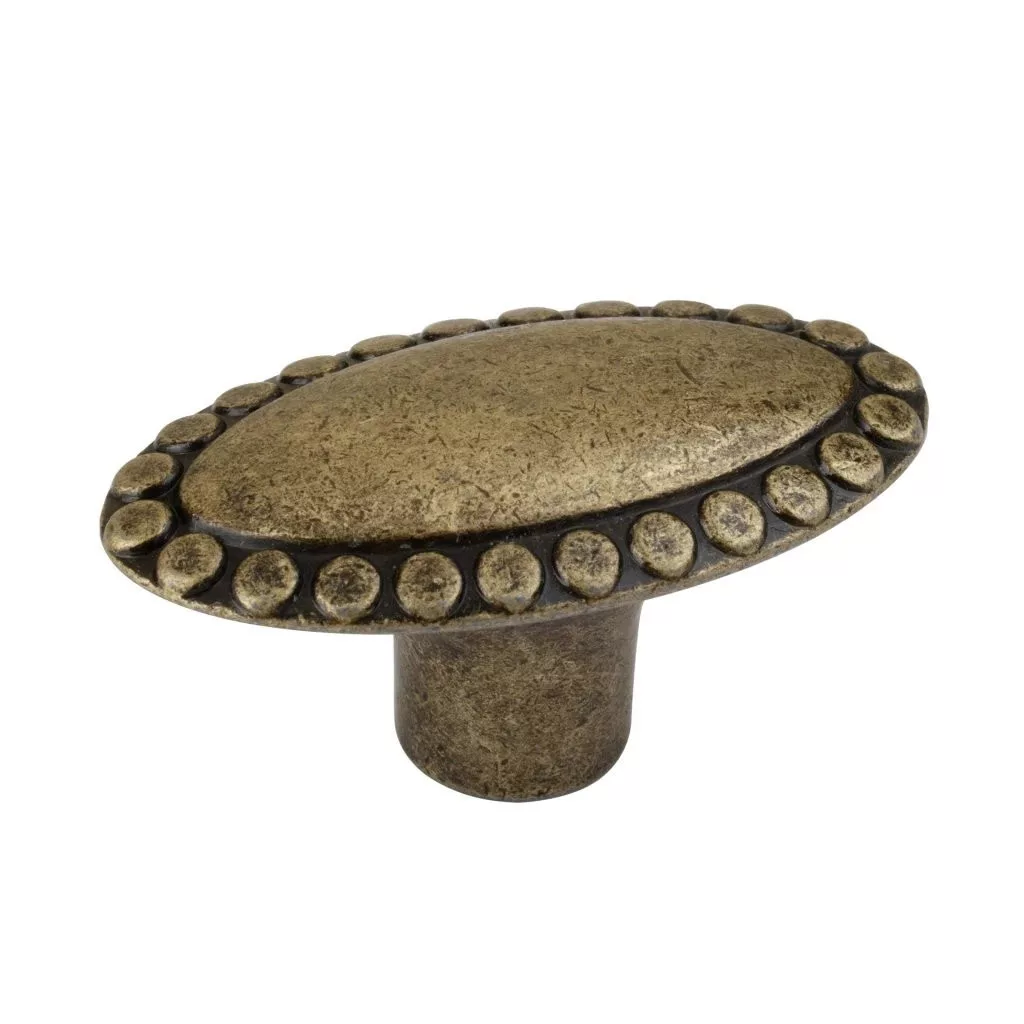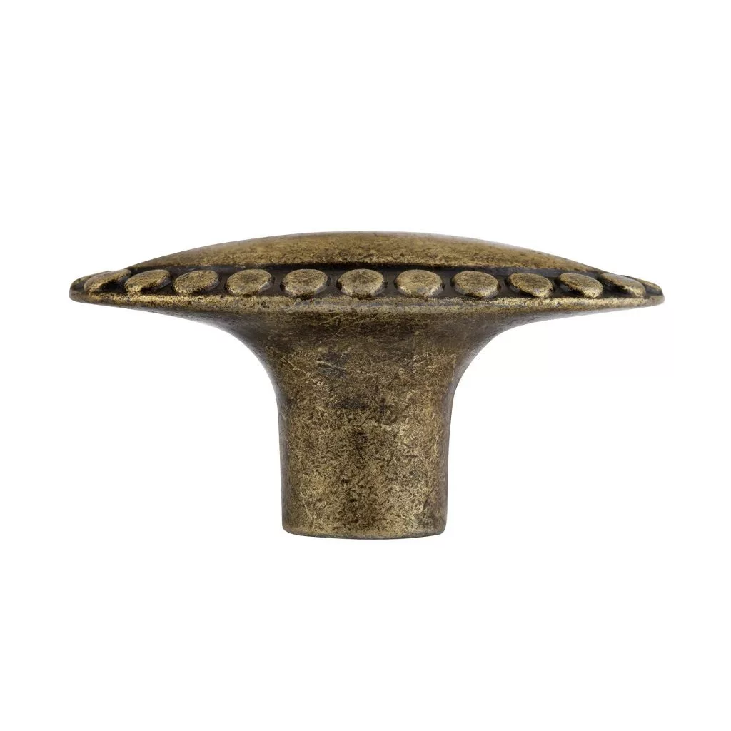 Tarent rusztikus bútorgomb antik sárgaréz kivitelben, 39 mm széles és 20 mm magas. Rögzítőcsavarral együtt.