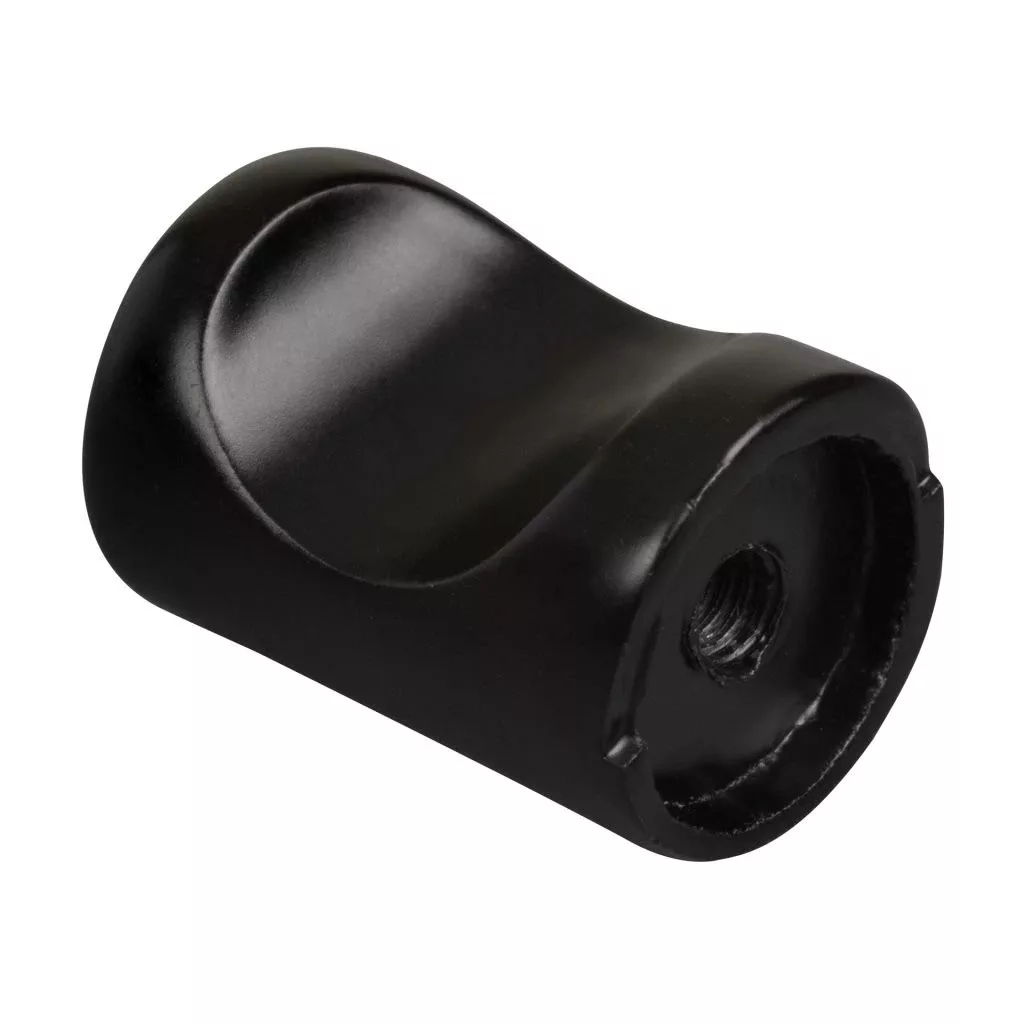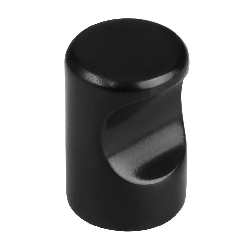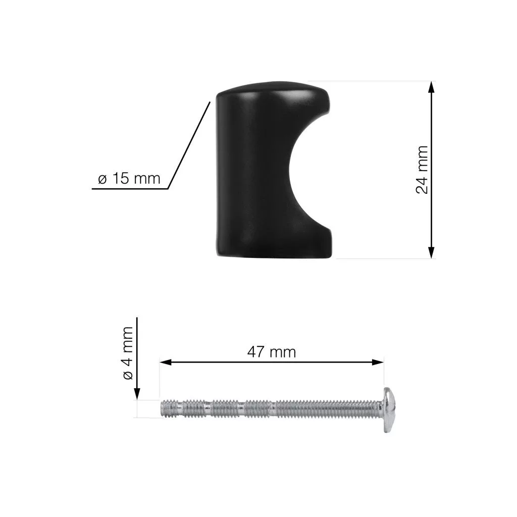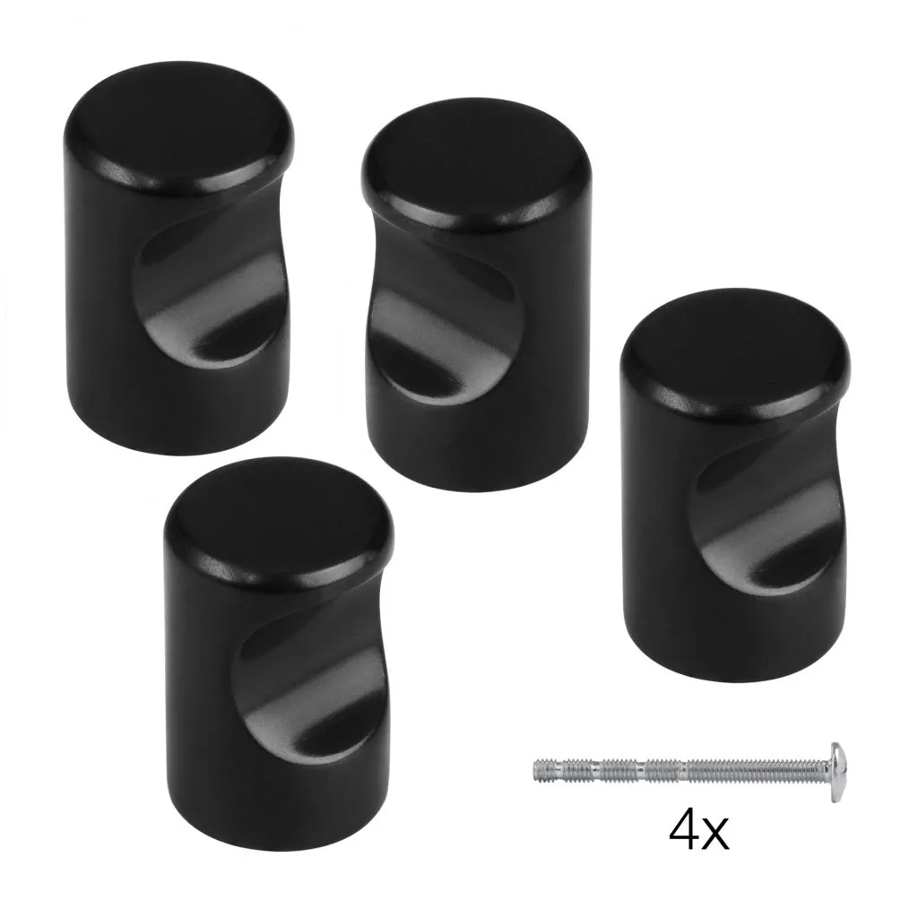 Modern fekete dizájnú bútorgomb-készlet, 15 mm átmérőjű és 24 mm magas. A csomag 4 gombot és mindegyikhez rögzítőcsavarokat tartalmaz.