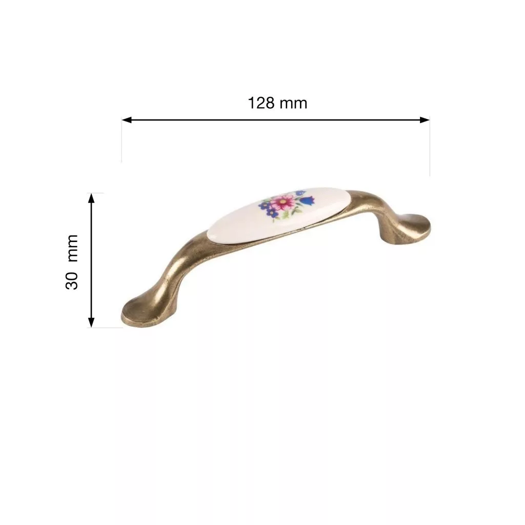 Rusztikus stílusú bútorfogantyú-készlet 96 mm-es rasztermérettel és antik sárgaréz felülettel, kiegészítve egy fehér porcelán fogantyúval, csokordísszel. Fogantyúhossz 125 mm, szélessége 19 mm és magassága 33 mm. A csomag 4 fogantyút és rögzítőcsavarokat tartalmaz.