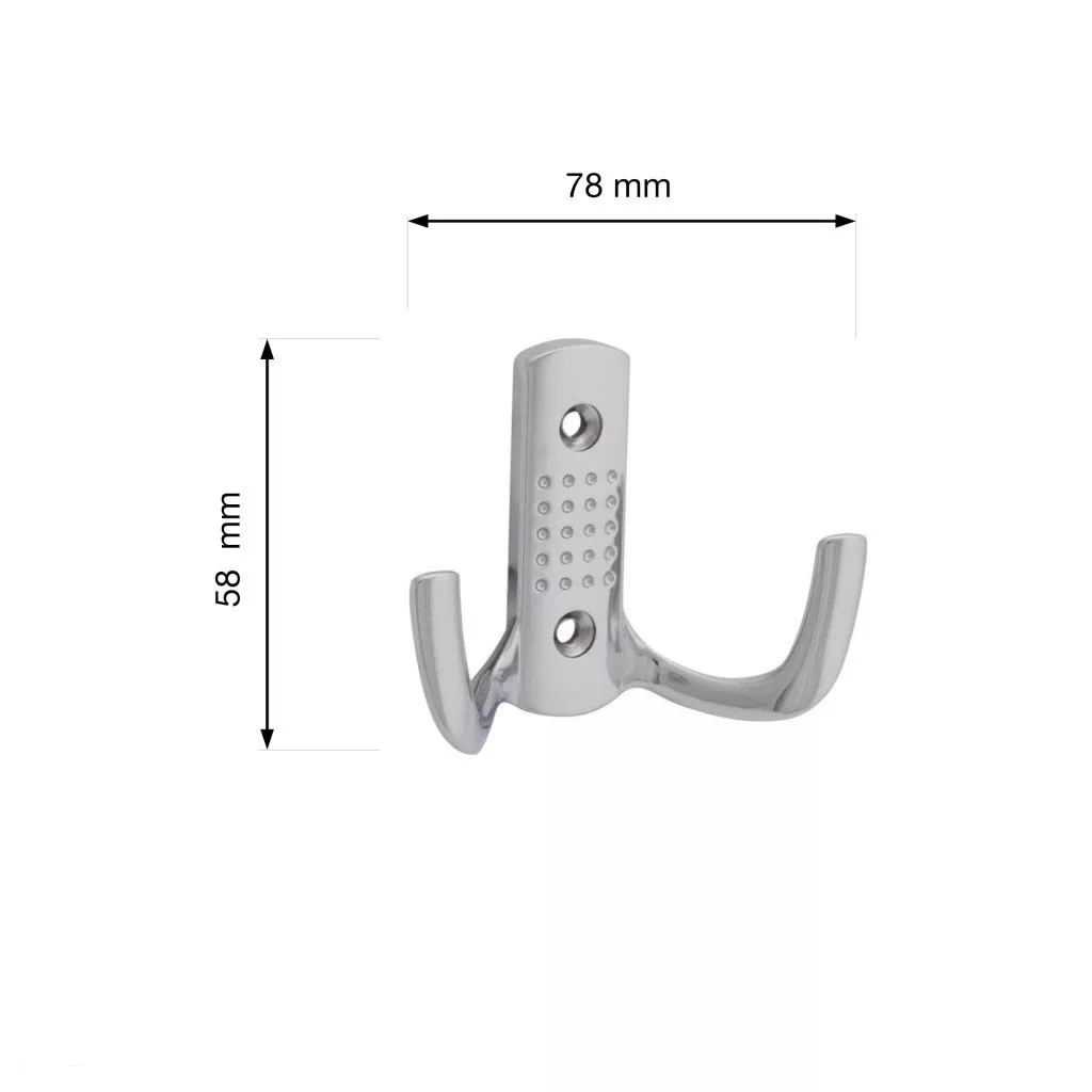 Klasszikus Camel II kabáttartó króm felülettel, két akasztóval, 78 mm széles, 58 mm magas és 27 mm mély. Falra vagy fa felületre való rögzítéshez 32 mm távolság. Rögzítőcsavarokkal együtt.