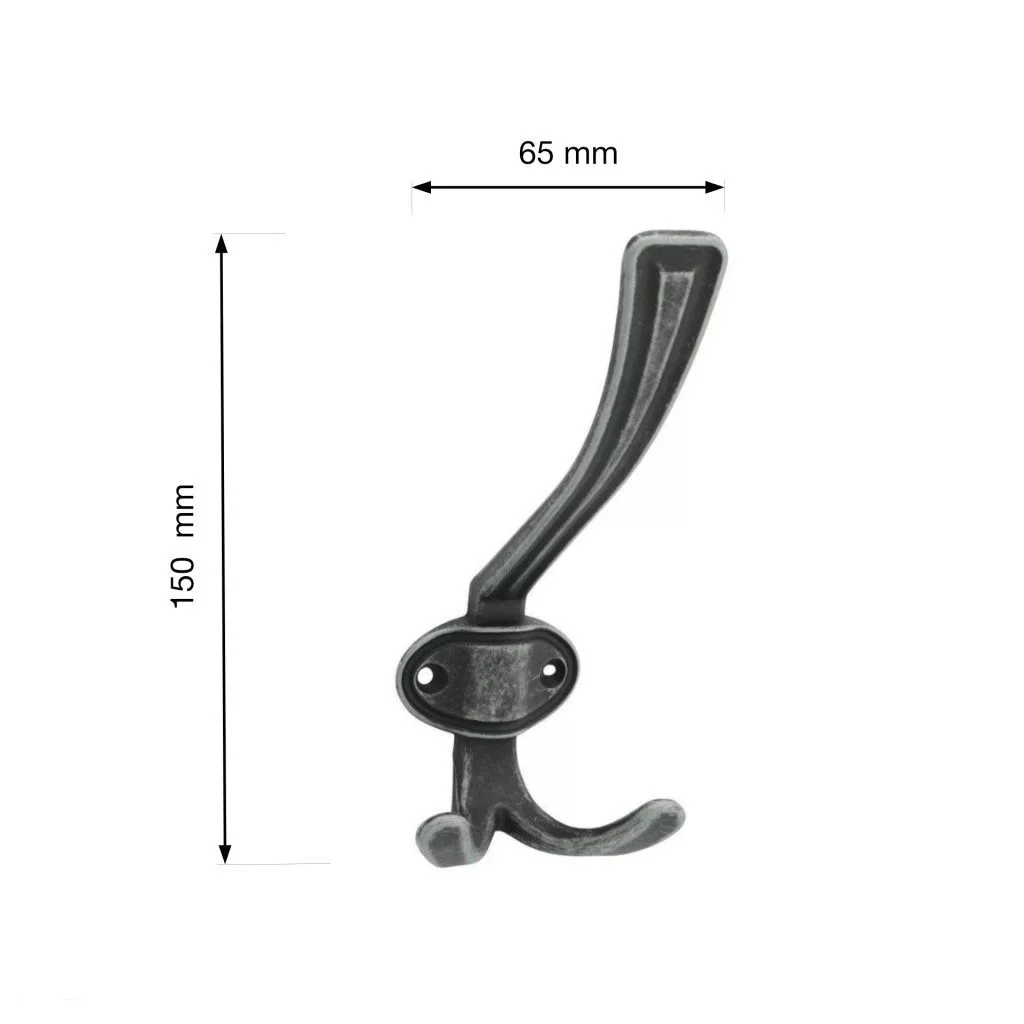 Rusztikus, Karlos I kabáttartó nikkel patinás felülettel, két akasztóval, 65 mm széles, 150 mm magas és 77 mm mély. Falra vagy fa felületre való rögzítéshez 32 mm távolság. Rögzítőcsavarokkal együtt.