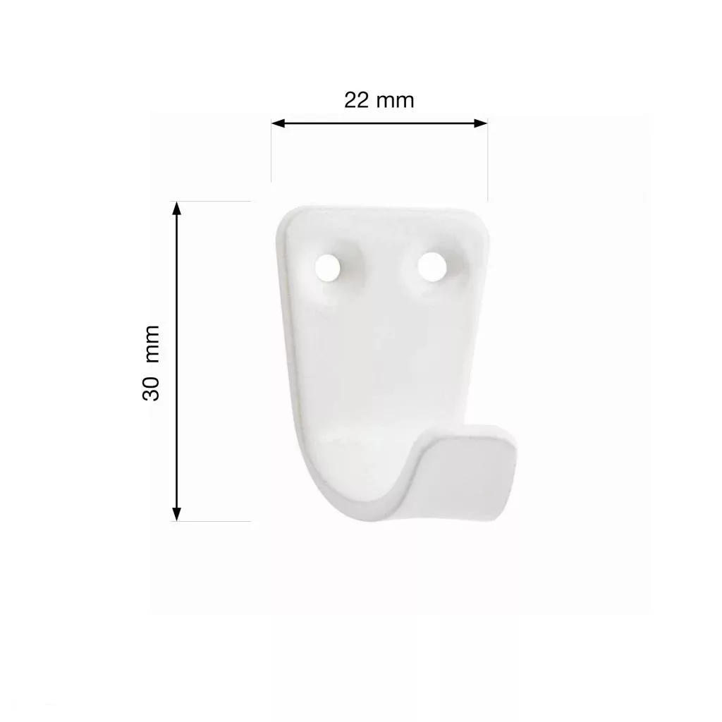Klasszikus kis fehér ruhaakasztó, 22 mm széles, 30 mm magas és 23 mm mély. Falra vagy fa felületre szereléshez a távolság 10,5 mm.