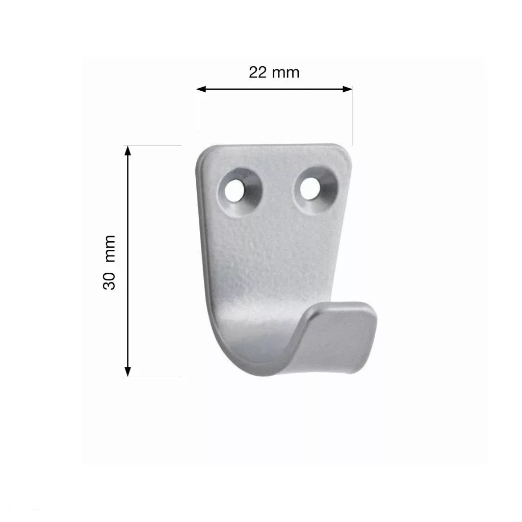 Klasszikus kis ruhaakasztó matt króm felülettel, 22 mm széles, 30 mm magas és 23 mm mély. Falra vagy fa felületre szereléshez 10,5 mm távolság.