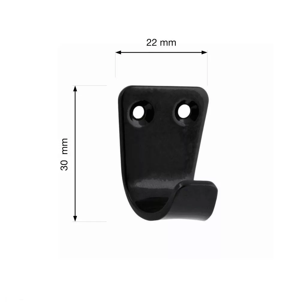 Klasszikus kis kabáttartó matt fekete színben, a Black Edition sorozatból, 22 mm szélességgel, 30 mm magassággal és 23 mm mélységgel. Falra vagy fa felületre szereléshez a távolság 10,5 mm.