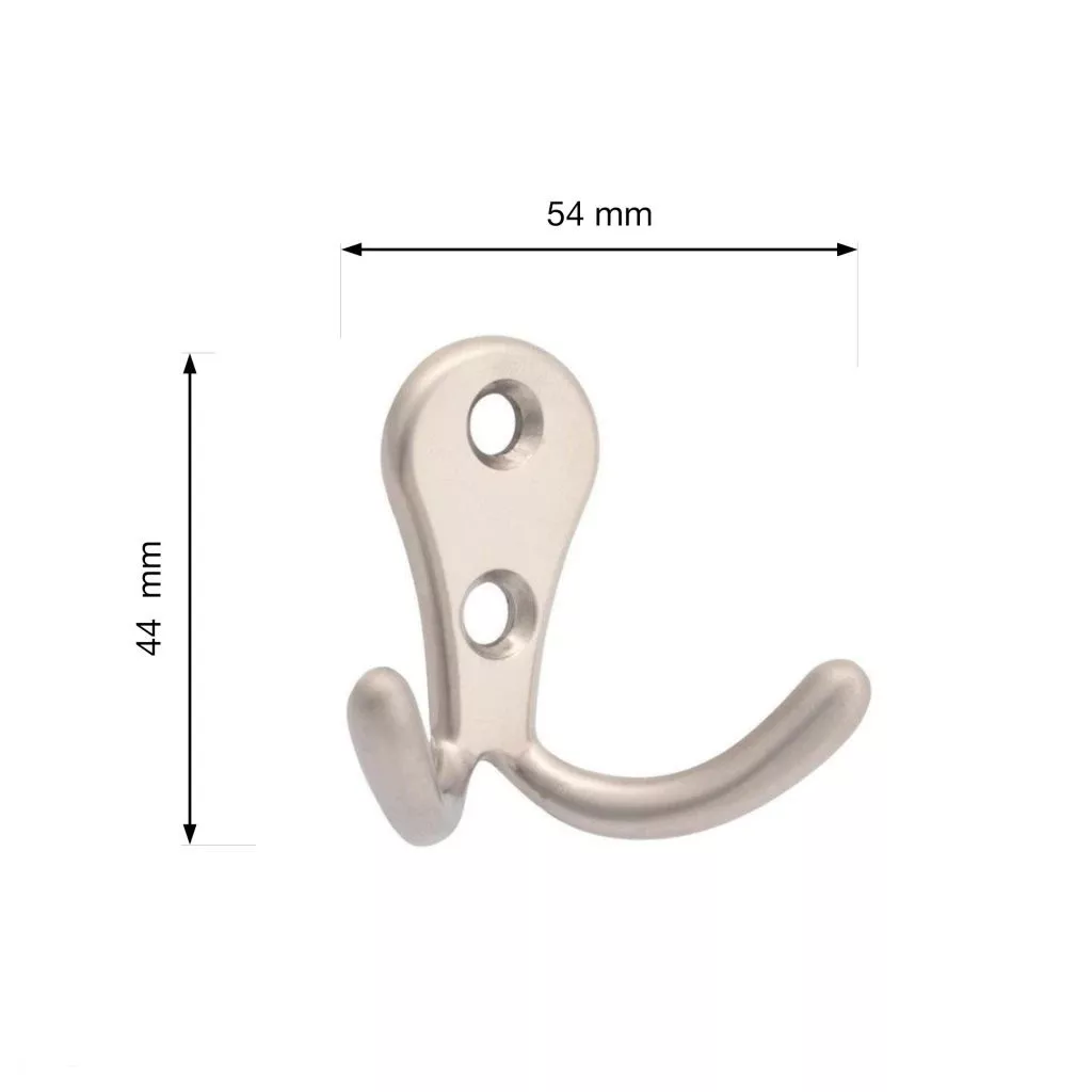 Klasszikus Romero II Matt nikkel felületű kabáttartó állvány két akasztóval, 54 mm széles, 44 mm magas és 24 mm mély. Falra vagy fa felületre való rögzítéshez 16 mm-es távolság. Rögzítőcsavarok mellékelve.