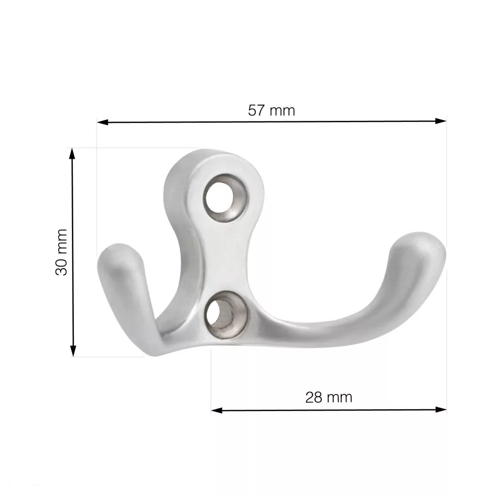 Klasszikus Romero II kabáttartó matt króm kivitelben, két 57 mm széles, 30 mm magas és 28 mm mély akasztóval. Falra vagy fa felületre való rögzítéshez 18 mm-es távolság. Rögzítőcsavarok mellékelve.