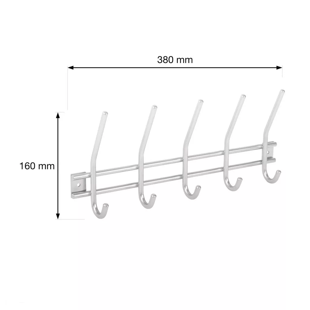 Ezüst színű kabáttartó fogas öt akasztóval, 380 mm széles, 160 mm magas és 50 mm mély.