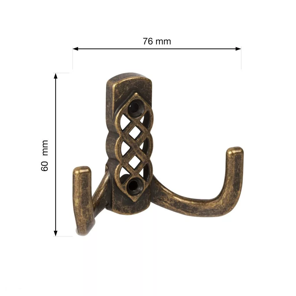 Rusztikus Santes II kabáttartó fogas antik sárgarézből, két akasztóval, 76 mm széles, 60 mm magas és 31 mm mély. Falra vagy fa felületre való rögzítéshez 32 mm távolság. Rögzítőcsavarokkal együtt.